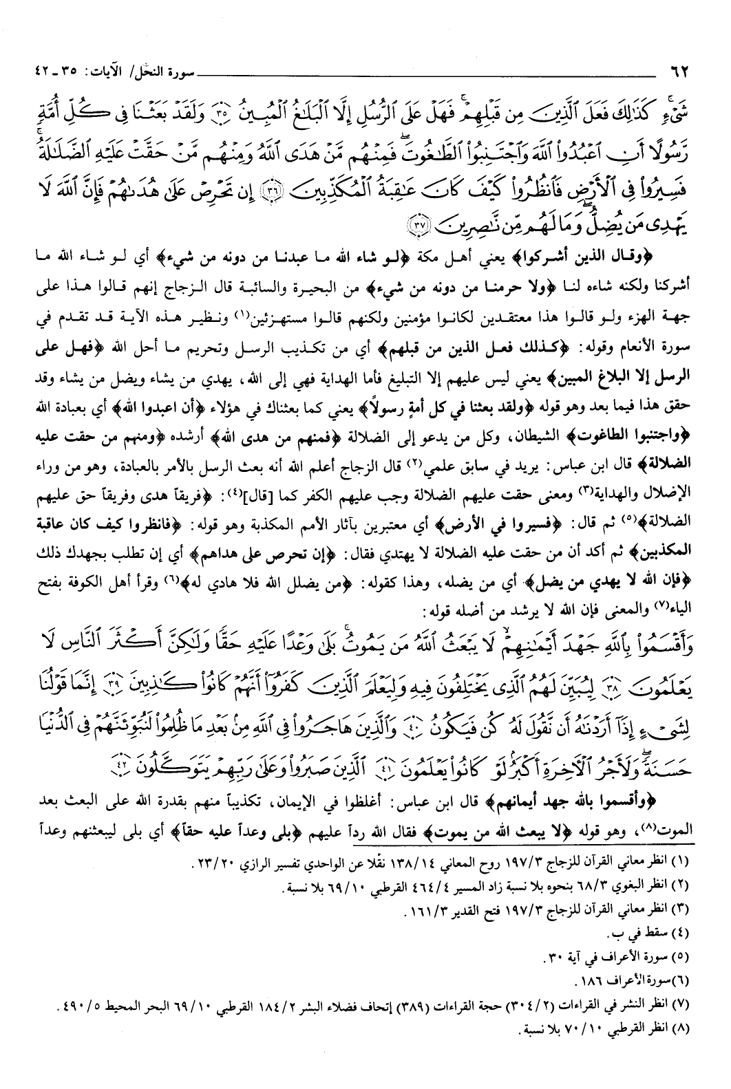 شَيْءٍ كَذَلِكَ فَعَلَ الَّذِينَ مِنْ قَبْلِهِمْ فَهَلْ عَلَى الرُّسُلِ إِلا الْبَلاغُ الْمُبِينُ {35} وَلَقَدْ بَعَثْنَا فِي كُلِّ أُمَّةٍ رَسُولا أَنِ اعْبُدُوا اللَّهَ وَاجْتَنِبُوا الطَّاغُوتَ فَمِنْهُمْ مَنْ هَدَى اللَّهُ وَمِنْهُمْ مَنْ حَقَّتْ عَلَيْهِ الضَّلالَةُ فَسِيرُوا فِي الأَرْضِ فَانْظُرُوا كَيْفَ كَانَ عَاقِبَةُ الْمُكَذِّبِينَ {36} إِنْ تَحْرِصْ عَلَى هُدَاهُمْ فَإِنَّ اللَّهَ لا يَهْدِي مَنْ يُضِلُّ وَمَا لَهُمْ مِنْ نَاصِرِينَ {37} } [النحل: 35-37] {وَقَالَ الَّذِينَ أَشْرَكُوا} [النحل: 35] يعني أهل مكة، {لَوْ شَاءَ اللَّهُ مَا عَبَدْنَا مِنْ دُونِهِ مِنْ شَيْءٍ} [النحل: 35] أي: لو شاء الله ما أشركنا، ولكنه شاءه لنا، {وَلا حَرَّمْنَا مِنْ دُونِهِ مِنْ شَيْءٍ} [النحل: 35] من البحيرة، والسائبة، قال الزجاج: إنهم قالوا هذا على جهة الهزء، ولو قالوا هذا معتقدين لكانوا مؤمنين، ولكنهم قالوا مستهزئين.