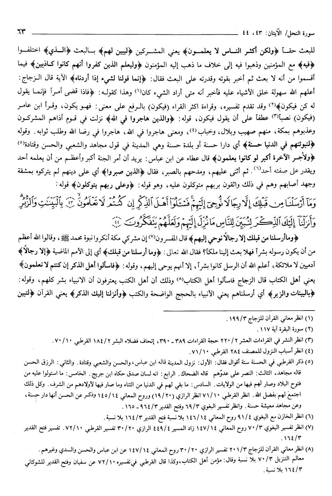 قوله: {وَمَا أَرْسَلْنَا مِنْ قَبْلِكَ إِلا رِجَالا نُوحِي إِلَيْهِمْ فَاسْأَلُوا أَهْلَ الذِّكْرِ إِنْ كُنْتُمْ لا تَعْلَمُونَ {43} بِالْبَيِّنَاتِ وَالزُّبُرِ وَأَنْزَلْنَا إِلَيْكَ الذِّكْرَ لِتُبَيِّنَ لِلنَّاسِ مَا نُزِّلَ إِلَيْهِمْ وَلَعَلَّهُمْ يَتَفَكَّرُونَ {44} } [النحل: 43-44] {وَمَا أَرْسَلْنَا مِنْ قَبْلِكَ إِلا رِجَالا نُوحِي إِلَيْهِمْ} [النحل: 43] قال المفسرون: إن مشركي مكة أنكروا نبوة محمد صَلَّى اللهُ عَلَيْهِ وَسَلَّمَ، وقالوا: الله أعظم من أن يكون رسوله بشرا، فهلا بعث إلينا ملكا؟ فقال الله تعالى: {وَمَا أَرْسَلْنَا مِنْ قَبْلِكَ} [النحل: 43] أي إلى الأمم الماضية إلا رجالا آدميين لا ملائكة، أعلم الله أن الرسل كانوا بشرا، إلا أنهم يوحى إليهم، وقوله: {فَاسْأَلُوا أَهْلَ الذِّكْرِ إِنْ كُنْتُمْ لا تَعْلَمُونَ} [النحل: 43] يعني أهل الكتاب، قال الزجاج: فاسألوا أهل الكتاب.