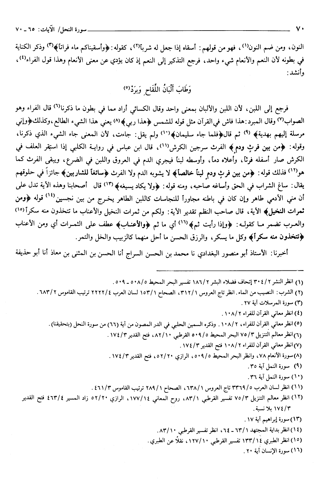 يعني هذا الشيء الطالع، وكذلك {وَإِنِّي مُرْسِلَةٌ إِلَيْهِمْ بِهَدِيَّةٍ} [النمل: 35] ثم قال: {فَلَمَّا جَاءَ سُلَيْمَانَ} [النمل: 36] ولم يقل: جاءت، لأن المعنى جاء الشيء الذي ذكرنا، وقوله: {مِنْ بَيْنِ فَرْثٍ وَدَمٍ} [النحل: 66] الفرث سرجين الكرش، قال ابن عباس في رواية الكلبي: إذا استقر العلف في الكرش صار أسفله فرثا، وأعلاه دما، وأوسطه لبنا، فيجري الدم في العروق، والبن في الضرع، ويبقى الفرث كما هو.