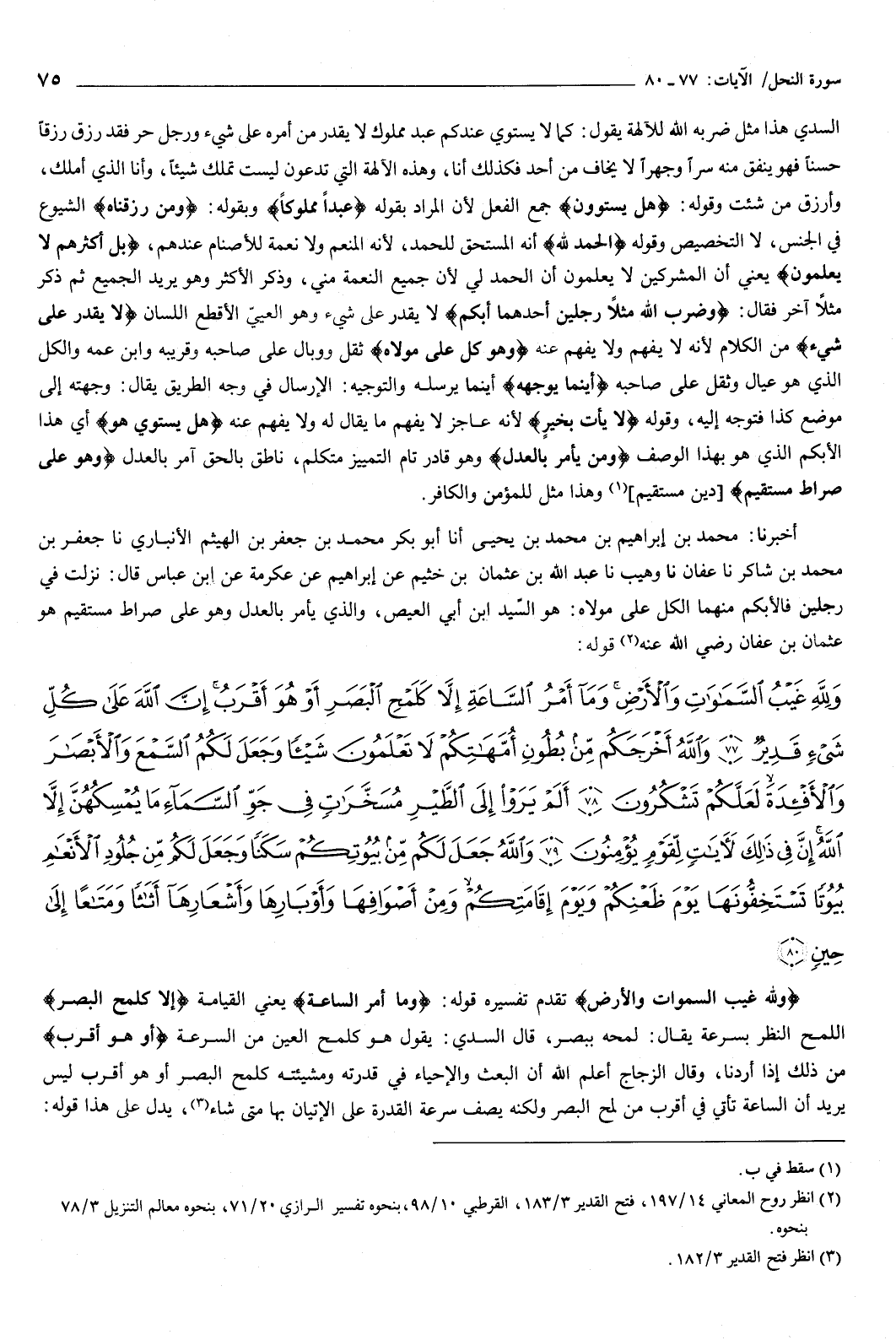 قوله: {وَلِلَّهِ غَيْبُ السَّمَوَاتِ وَالأَرْضِ وَمَا أَمْرُ السَّاعَةِ إِلا كَلَمْحِ الْبَصَرِ أَوْ هُوَ أَقْرَبُ إِنَّ اللَّهَ عَلَى كُلِّ شَيْءٍ قَدِيرٌ {77} وَاللَّهُ أَخْرَجَكُمْ مِنْ بُطُونِ أُمَّهَاتِكُمْ لا تَعْلَمُونَ شَيْئًا وَجَعَلَ لَكُمُ السَّمْعَ وَالأَبْصَارَ وَالأَفْئِدَةَ لَعَلَّكُمْ تَشْكُرُونَ {78} أَلَمْ يَرَوْا إِلَى الطَّيْرِ مُسَخَّرَاتٍ فِي جَوِّ السَّمَاءِ مَا يُمْسِكُهُنَّ إِلا اللَّهُ إِنَّ فِي ذَلِكَ لآيَاتٍ لِقَوْمٍ يُؤْمِنُونَ {79} وَاللَّهُ جَعَلَ لَكُمْ مِنْ بُيُوتِكُمْ سَكَنًا وَجَعَلَ لَكُمْ مِنْ جُلُودِ الأَنْعَامِ بُيُوتًا تَسْتَخِفُّونَهَا يَوْمَ ظَعْنِكُمْ وَيَوْمَ إِقَامَتِكُمْ وَمِنْ أَصْوَافِهَا وَأَوْبَارِهَا وَأَشْعَارِهَا أَثَاثًا وَمَتَاعًا إِلَى حِينٍ {80} } [النحل: 77-80] {وَلِلَّهِ غَيْبُ السَّمَوَاتِ وَالأَرْضِ} [النحل: 77] تقدم تفسيره، قوله: {وَمَا أَمْرُ السَّاعَةِ} [النحل: 77] يعني القيامة، {إِلا كَلَمْحِ الْبَصَرِ} [النحل: 77] اللمح النظر بسرعة، يقال: لمحه ببصر، قال السدي: يقول: هو كلمح العين من السرعة.