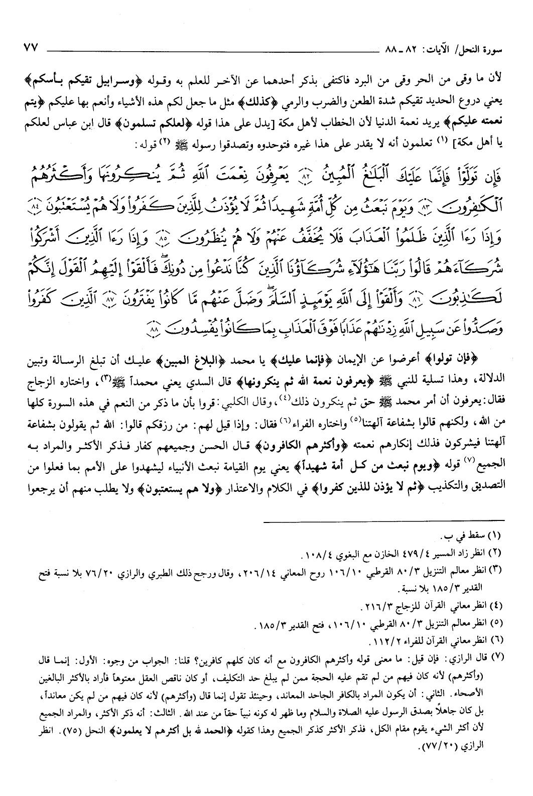 قوله: {فَإِنْ تَوَلَّوْا فَإِنَّمَا عَلَيْكَ الْبَلاغُ الْمُبِينُ {82} يَعْرِفُونَ نِعْمَتَ اللَّهِ ثُمَّ يُنْكِرُونَهَا وَأَكْثَرُهُمُ الْكَافِرُونَ {83} وَيَوْمَ نَبْعَثُ مِنْ كُلِّ أُمَّةٍ شَهِيدًا ثُمَّ لا يُؤْذَنُ لِلَّذِينَ كَفَرُوا وَلا هُمْ يُسْتَعْتَبُونَ {84} وَإِذَا رَأَى الَّذِينَ ظَلَمُوا الْعَذَابَ فَلا يُخَفَّفُ عَنْهُمْ وَلا هُمْ يُنْظَرُونَ {85} وَإِذَا رَأَى الَّذِينَ أَشْرَكُوا شُرَكَاءَهُمْ قَالُوا رَبَّنَا هَؤُلاءِ شُرَكَاؤُنَا الَّذِينَ كُنَّا نَدْعُو مِنْ دُونِكَ فَأَلْقَوْا إِلَيْهِمُ الْقَوْلَ إِنَّكُمْ لَكَاذِبُونَ {86} وَأَلْقَوْا إِلَى اللَّهِ يَوْمَئِذٍ السَّلَمَ وَضَلَّ عَنْهُمْ مَا كَانُوا يَفْتَرُونَ {87} الَّذِينَ كَفَرُوا وَصَدُّوا عَنْ سَبِيلِ اللَّهِ زِدْنَاهُمْ عَذَابًا فَوْقَ الْعَذَابِ بِمَا كَانُوا يُفْسِدُونَ {88} } [النحل: 82-88] فإن تولوا أعرضوا عن الإيمان، فإنما عليك يا محمد، البلاغ المبين عليك أن تبلغ الرسالة وتبين الدلالة، وهذا تسلية للنبي صَلَّى اللهُ عَلَيْهِ وَسَلَّمَ.