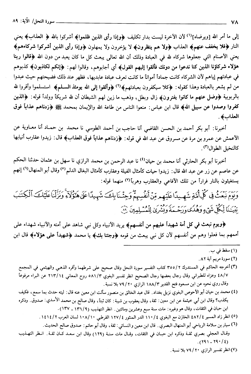 قوله: {وَيَوْمَ نَبْعَثُ فِي كُلِّ أُمَّةٍ شَهِيدًا عَلَيْهِمْ مِنْ أَنْفُسِهِمْ وَجِئْنَا بِكَ شَهِيدًا عَلَى هَؤُلاءِ وَنَزَّلْنَا عَلَيْكَ الْكِتَابَ تِبْيَانًا لِكُلِّ شَيْءٍ وَهُدًى وَرَحْمَةً وَبُشْرَى لِلْمُسْلِمِينَ} [النحل: 89] {وَيَوْمَ نَبْعَثُ فِي كُلِّ أُمَّةٍ شَهِيدًا عَلَيْهِمْ مِنْ أَنْفُسِهِمْ} [النحل: 89] يريد الأنبياء، وكل نبي شاهد على أمته، والأنبياء شهداء على أممهم بما فعلوا وهم من أنفسهم، لأن كل نبي يبعث من قومه، وجئنا بك يا محمد، {شَهِيدًا عَلَى هَؤُلاءِ} [النحل: 89] قال ابن
