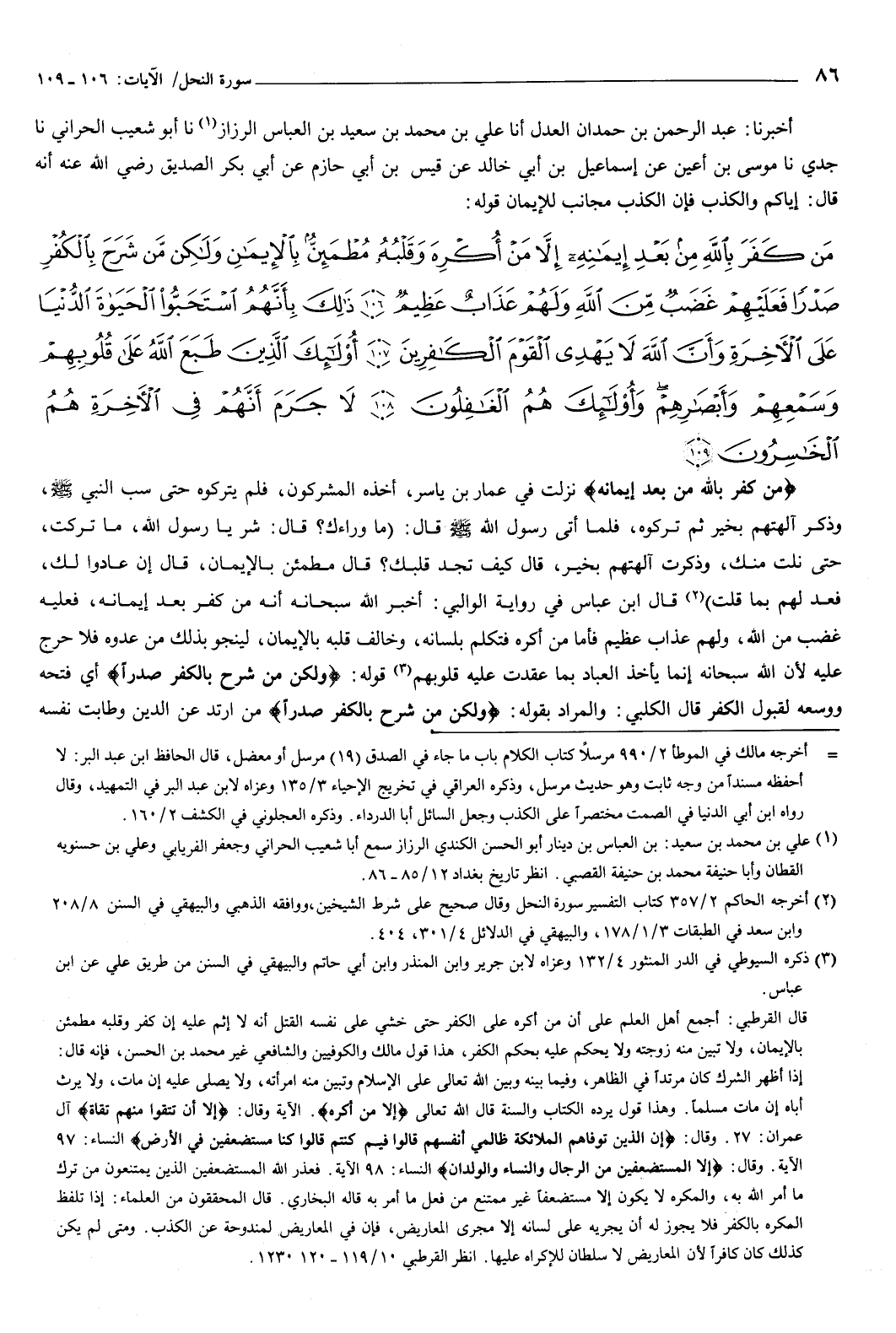 قوله: {مَنْ كَفَرَ بِاللَّهِ مِنْ بَعْدِ إِيمَانِهِ إِلا مَنْ أُكْرِهَ وَقَلْبُهُ مُطْمَئِنٌّ بِالإِيمَانِ وَلَكِنْ مَنْ شَرَحَ بِالْكُفْرِ صَدْرًا فَعَلَيْهِمْ غَضَبٌ مِنَ اللَّهِ وَلَهُمْ عَذَابٌ عَظِيمٌ {106} ذَلِكَ بِأَنَّهُمُ اسْتَحَبُّوا الْحَيَاةَ الدُّنْيَا عَلَى الآخِرَةِ وَأَنَّ اللَّهَ لا يَهْدِي الْقَوْمَ الْكَافِرِينَ {107} أُولَئِكَ الَّذِينَ طَبَعَ اللَّهُ عَلَى قُلُوبِهِمْ وَسَمْعِهِمْ وَأَبْصَارِهِمْ وَأُولَئِكَ هُمُ الْغَافِلُونَ {108} لا جَرَمَ أَنَّهُمْ فِي الآخِرَةِ هُمُ الْخَاسِرونَ {109} } [النحل: 106-109] {مَنْ كَفَرَ بِاللَّهِ مِنْ بَعْدِ إِيمَانِهِ} [النحل: 106] نزلت في عمار بن ياسر، أخذه المشركون، فلم يتركوه حتى سب النبي صَلَّى اللهُ عَلَيْهِ وَسَلَّمَ، وذكر آلهتهم بخير، ثم تركوه، فلما أتى رسول الله صَلَّى اللهُ عَلَيْهِ وَسَلَّمَ، قال: «ما وراءك» .