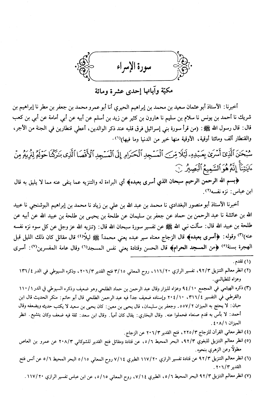 {سُبْحَانَ الَّذِي أَسْرَى بِعَبْدِهِ لَيْلا مِنَ الْمَسْجِدِ الْحَرَامِ إِلَى الْمَسْجِدِ الأَقْصَى الَّذِي بَارَكْنَا حَوْلَهُ لِنُرِيَهُ مِنْ آيَاتِنَا إِنَّهُ هُوَ السَّمِيعُ الْبَصِيرُ} [الإسراء: 1] بسم الله الرحمن الرحيم {سُبْحَانَ الَّذِي أَسْرَى بِعَبْدِهِ} [الإسراء: 1] أي: البراءة له، والتنزيه عما ينفى عنه مما لا يليق به، قال ابن عباس: نزه نفسه.