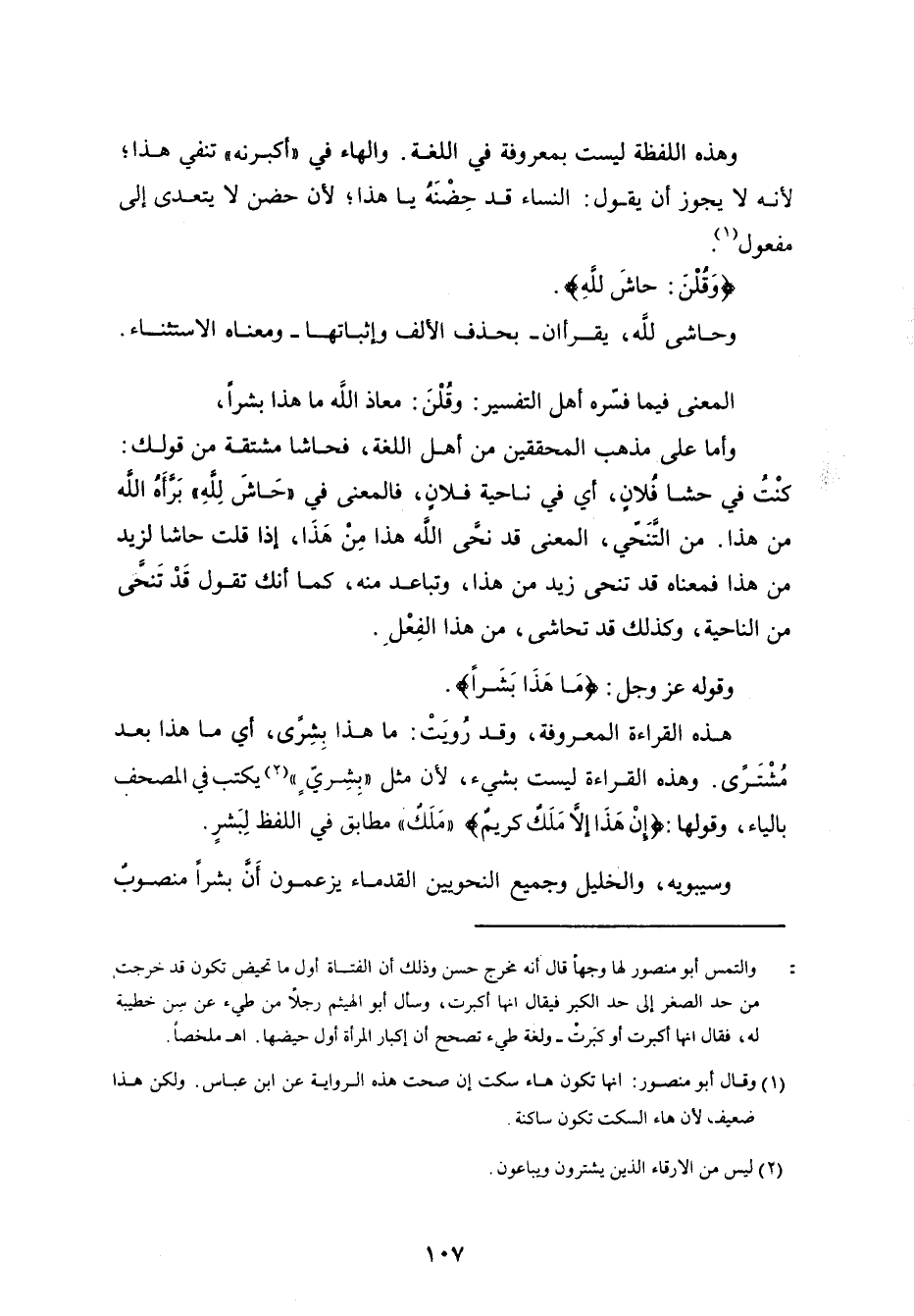والأَوْلى أن يقال: الذي يظهر في الجواب عن قراءةِ العامة أنها اسمُ منصوبٌ كما تقدَّم تقريره، ويدلُّ عليه قراءة أبي السمَّال «حاشاً للَّه» منصوباً، ولكنهم أَبْدلوا التنوين ألفاً كما يبدلونه في الوقف، ثم إنهم أَجْروا الوصل مجرى الوقف كما فعلوا ذلك في مواضعَ كثيرةٍ تقدَّم منها جملةٌ وسيمر بك مثلها.
