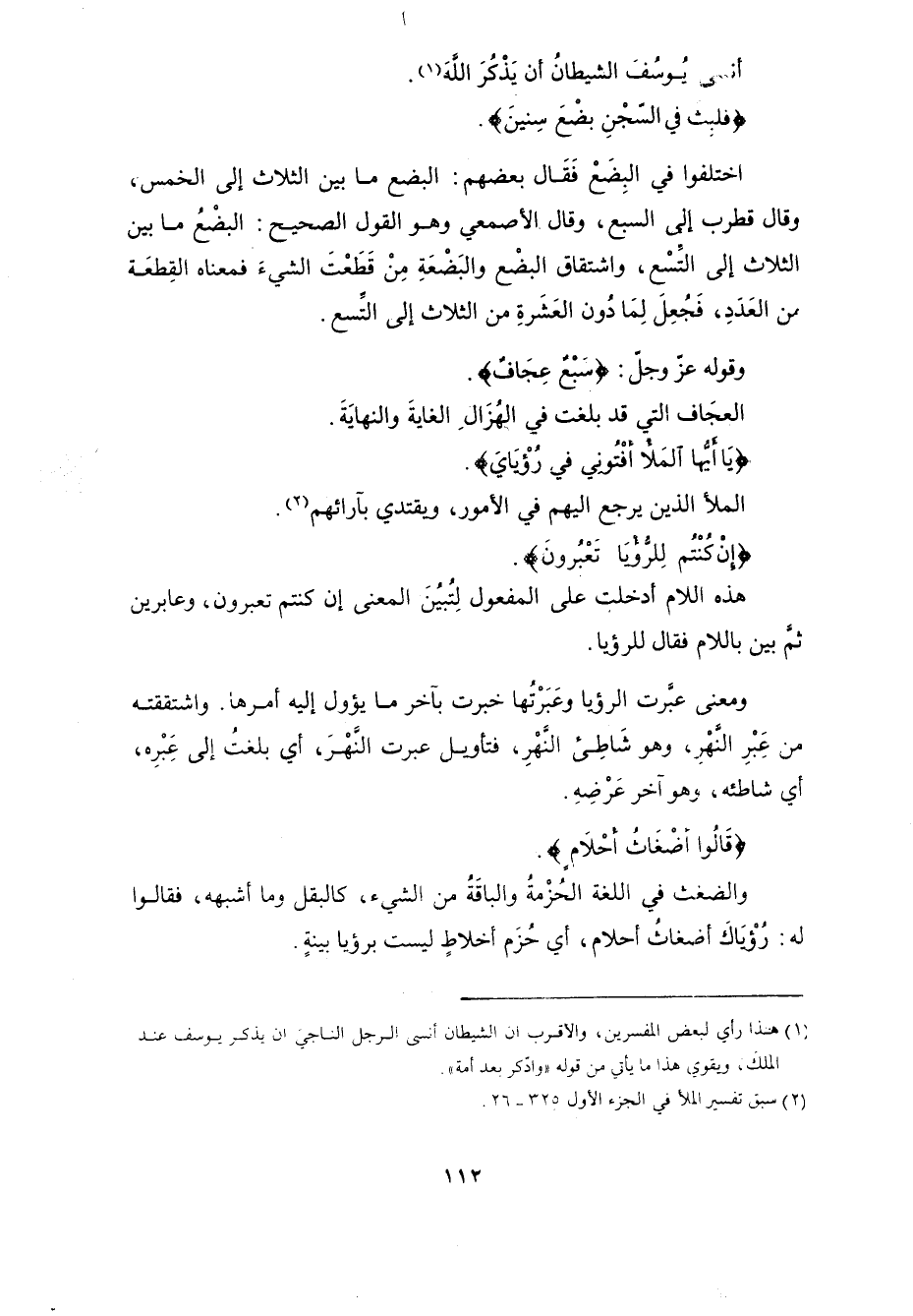 (1) هذا رأي لبعض المفسرين، والأقرب أن الشيطان أنسى الرجل الناجي أن يذكر يوسف عند الملك، ويقوي هذا ما يأتي من قوله (وَقَالَ الَّذِي نَجَا مِنْهُمَا وَادَّكَرَ بَعْدَ أُمَّةٍ أَنَا أُنَبِّئُكُمْ بِتَأْوِيلِهِ فَأَرْسِلُونِ (45).