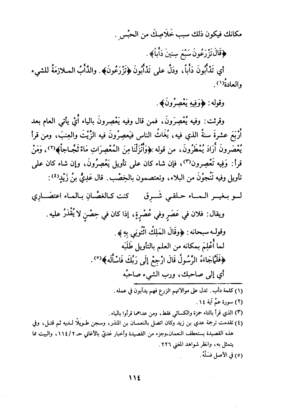 ونقل النقاش قراءةَ» يُعَصِّرون «بضم الياء وفتح العين وكسر الصادِ مشددةً مِنْ» عَصَّر «للتكثير. وهذه القراءةُ وقراءةُ زيدٍ المتقدمة تحتملان أن يكونا مِن العَصْر للنبات أو الضرع، أو النجاة كقول الآخر: