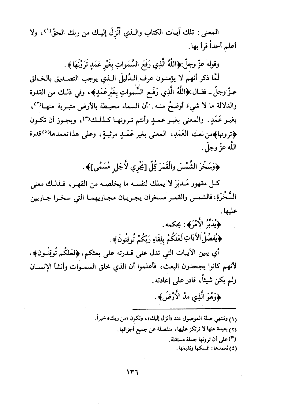 وقوله عزَّ وجلَّ: (اللَّهُ الَّذِي رَفَعَ السَّمَاوَاتِ بِغَيْرِ عَمَدٍ تَرَوْنَهَا ثُمَّ اسْتَوَى عَلَى الْعَرْشِ وَسَخَّرَ الشَّمْسَ وَالْقَمَرَ كُلٌّ يَجْرِي لِأَجَلٍ مُسَمًّى يُدَبِّرُ الْأَمْرَ يُفَصِّلُ الْآيَاتِ لَعَلَّكُمْ بِلِقَاءِ رَبِّكُمْ تُوقِنُونَ (2)