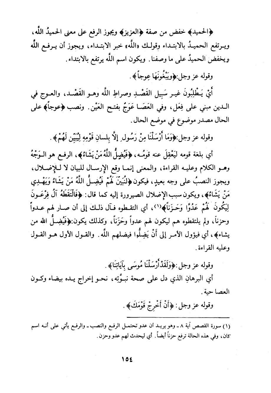 ويجوز النصبُ على وجه بعيدٍ، فيكون (لِيُبَيِّنَ لَهُمْ فَيُضِلُّ اللَّهُ مَنْ يَشَاءُ وَيَهْدِي)، ويكون سبب الإِضلال الصيرورة إليه كما قال: (فَالْتَقَطَهُ آلُ فِرْعَوْنَ لِيَكُونَ لَهُمْ عَدُوًّا وَحَزَنًا)، أي التقطوه فآل ذلك إِلى أن صار لهم عدواً وحزناَ، ولم يلتقطوه هم ليكون لهم عدواً وحَزَناً، وكذلك يكون: (فَيُضِلُّ اللَّهُ مَنْ يَشَاءُ)، أي فيؤول الأمر إلى أَنْ يَضِلُوا فيضلهم اللَّه.