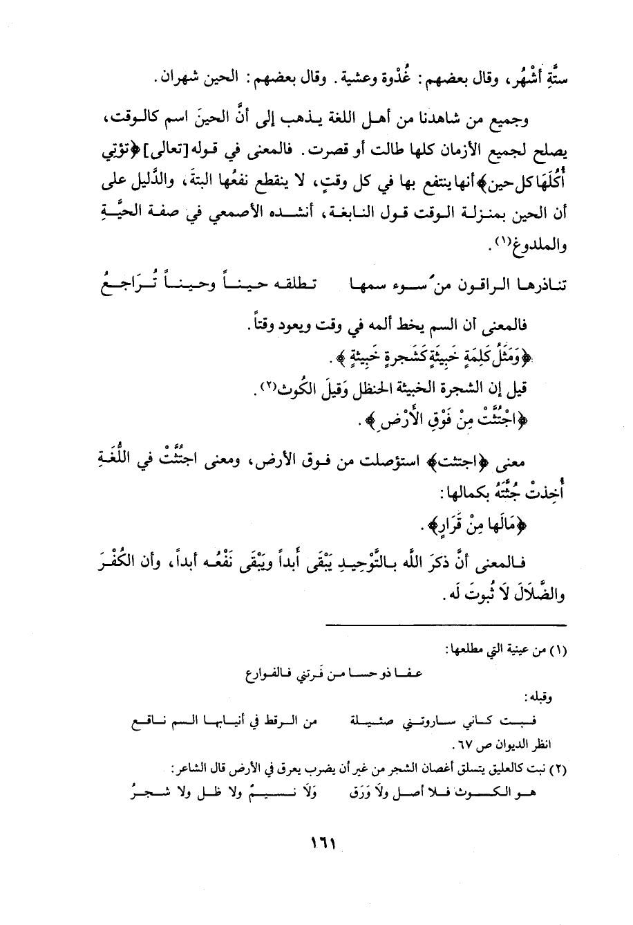 فالمعنى في قوله تعالى (تُؤْتِي أُكُلَهَا كُلَّ حِينٍ) أنهاينتفع بها في كل وقتٍ، لا ينقطع نفعها ألبتَّةَ، والدَّليل على أن الحين بمنزلة الوقت قول النابغة، أنشده الأصمعي في صفة الحيَّةِ والملدوغ.