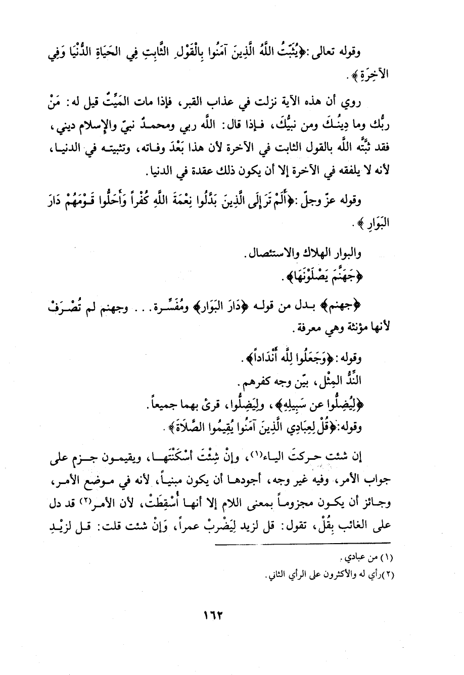 الثاني: أنَّ «يُقيموا» مجزوم على جوابِ «قُلْ»، وإليه نحا الأخفش والمبرد. وقد رَدَّ الناسُ عليهما هذا بأنه لا يلزمُ مِنْ قوله لهم: أقيموا «أَنْ يَفْعلوا، وكم مَنْ تخلَّف عن هذا الأمر. وقد أجيب عن هذا: بأنَّ المرادَ بالعباد المؤمنون، ولذلك أضافهم إليه تشريفاً، والمؤمنون متى أَمَرَهم امْتَثَلُوا.