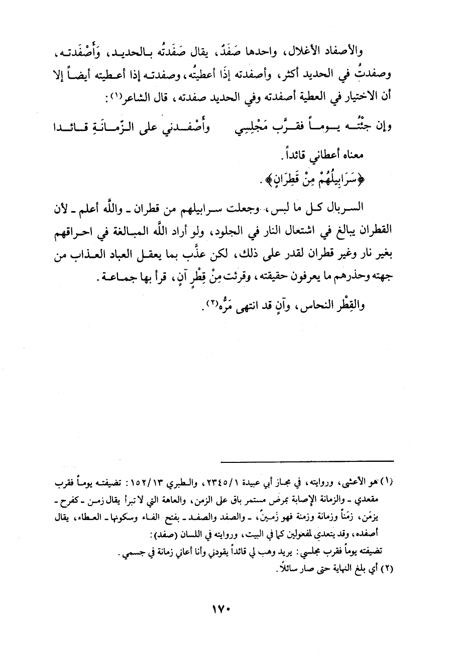 وجعلت سرابيلهم من قطران - واللَّه أعلم - لأن القطران يبالغ في اشتعال النار في الجلود، ولو أراد الله المبالغة في إحراقهم