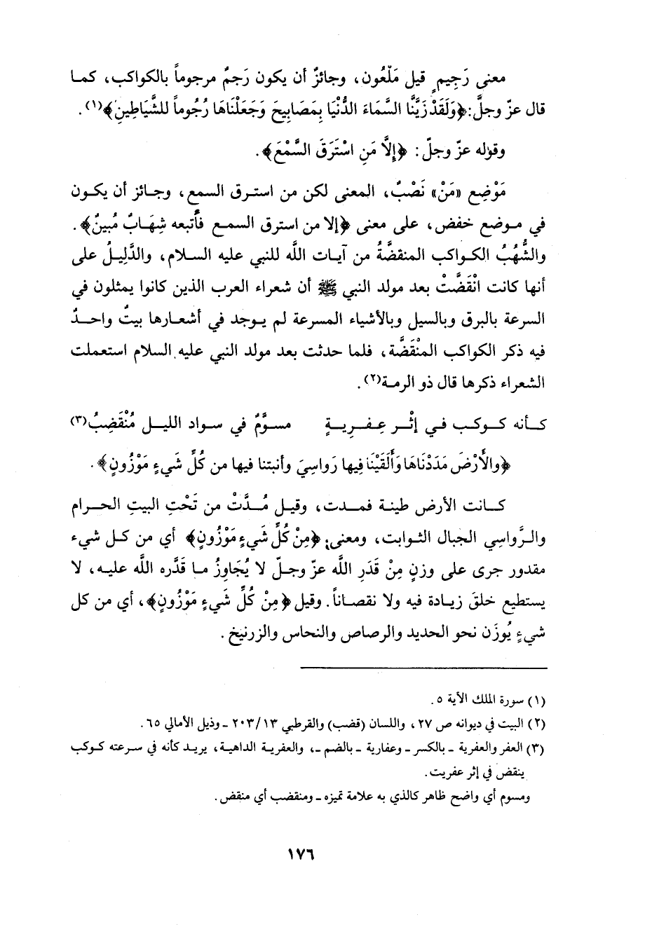 أنها كانت انْقَضَّتْ بعد مولد النبي - صلى الله عليه وسلم - أن شعراء العرب الذين كانوا يمثلون في السرعة بالبرق وبالسيل وبالأشياء المسرعة لم يوجد في أشعارها بيتٌ واحدٌ فيه ذكر الكواكب المنْقَضَّة، فلما حدثت بعد مولد النبي عليه السلام استعملت الشعراء ذكرها قال ذو الرمة.