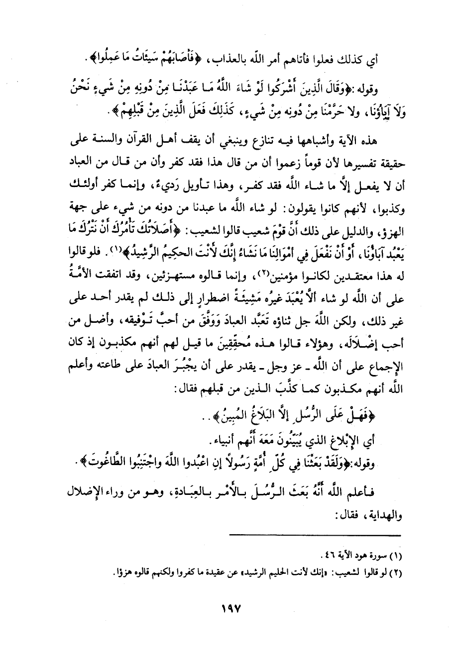 وقد اتفقت الأمَّةُ على أن الله لو شاء ألا يُعْبَدَ غيرُه مَشِيئَةً اضطرار إلى ذلك لم يقدر أحد على غير ذلك، ولكن اللَّهَ جل ثناؤه تَعَبَّد العبادَ وَوَفَقَ من أحبَّ تَوْفيقه، وأضل من أحب إضْلَالَه، وهؤلاء قالوا هذه مُحقِّقِينَ ما قيل لهم أنهم مكذبون إذ كان الِإجماع على أن اللَّه - عزَّ وجلَّ - يقدر على أن يجْبُرَ العبادَ على طاعته وأعلم اللَّه أنهم مكذبون كما كذبَ الذين من قبلهم فقال: