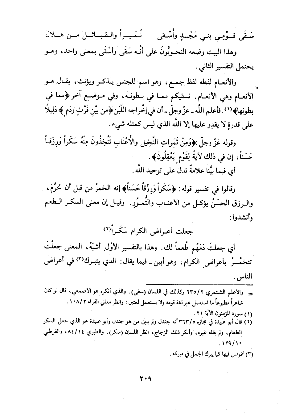وقيل: إنما ذَكَّر الضميرَ لأنه يعودُ على البعض وهو الإِناث؛ لأنَّ الذكورَ لا أَلْبانَ لها، فكأنَّ العِبْرَة هي بعض الأنعام. وقال الكسائي: «أي في بطونِ ما ذَكَرَ». قال المبرد: «وهذا شائعٌ في القرآن، قال تعالى: {كَلاَّ إِنَّهَا تَذْكِرَةٌ فَمَن شَآءَ ذَكَرَهُ} [عبس: 1112]، أي: ذَكَر هذا الشيءَ. وقال تعالى: {فَلَماَّ رَأَى الشمس بَازِغَةً قَالَ هذا رَبِّي} [الأنعام: 78]، أي: هذا الشيءُ الطالعُ، ولا يكون هذا إلا في التأنيث المجازيِّ، لا يجوز: جاريتُك ذهب». قلت: وعلى ذلك خُرِّج قوله: