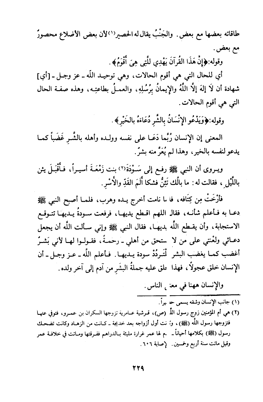 فأرْخَتْ مِن كِتَافه، فلما نامت أخرج يده وهرب، فلما أصبح النبي - صلى الله عليه وسلم - دعا به فأعلم شأنه، فقال اللهم اقطع يديها، فرفعت سودة يديها تتوقع الاستجابة، وأن يقطع الله يديها، فقال النبي - صلى الله عليه وسلم - وإني سألت الله أن يجعل دعائي ولعْنتي على من لا يستحق من أهلي رحمةً، فقولوا لها لأني بَشرٌ أغضب كما يغضب البشر لْتَردُدْ سودة يديها. فأَعلم اللَّه - عزَّ وجلَّ - أن الإنسان خلق عجولاً، فهذا ضلق عليه جملةُ البشَرِ من آدم إلى آخر ولده.
