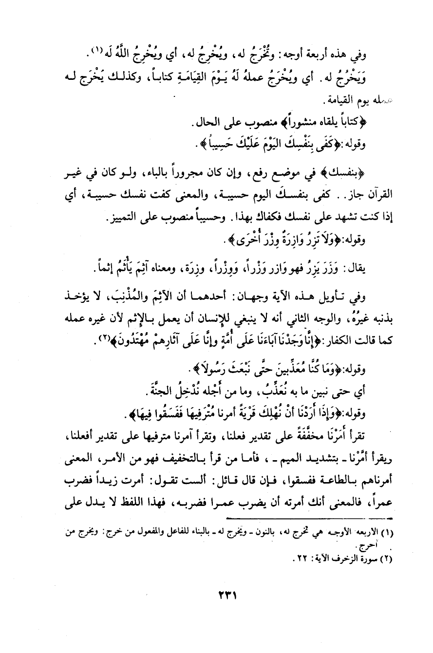 والوجه الثاني: أنَّ» أَمَرْنا «بمعنى كَثَّرْنا، ولم يَرْتَضِ الزمخشريُّ في ظاهرِ عبارتِه فإنَّه قال:» وفسَّرَ بعضُهم «أَمَرْنا» ب «كَثَّرْنا»، وجَعَلَه من بابِ: فَعَّلْتُه فَفَعَلَ، كَثَبَّرْتُه فَثَبَر. وفي الحديثِ: «خَيْرُ المالِ سِكَّةٌ مأْبُوْرة ومُهْرَةٌ مَأْمورة»، أي: كثيرةُ النِّتاج «. قلت: وقد حكى أبو حاتم هذه اللغةَ، يقال: أَمِر القومُ، وأَمَرهم اللهُ، ونقله الواحديُّ أيضاً عن أهل اللغة، وقال أبو علي:» الجيِّد في «أَمَرْنا» أن يكونَ بمعنى كَثَّرْنا «.