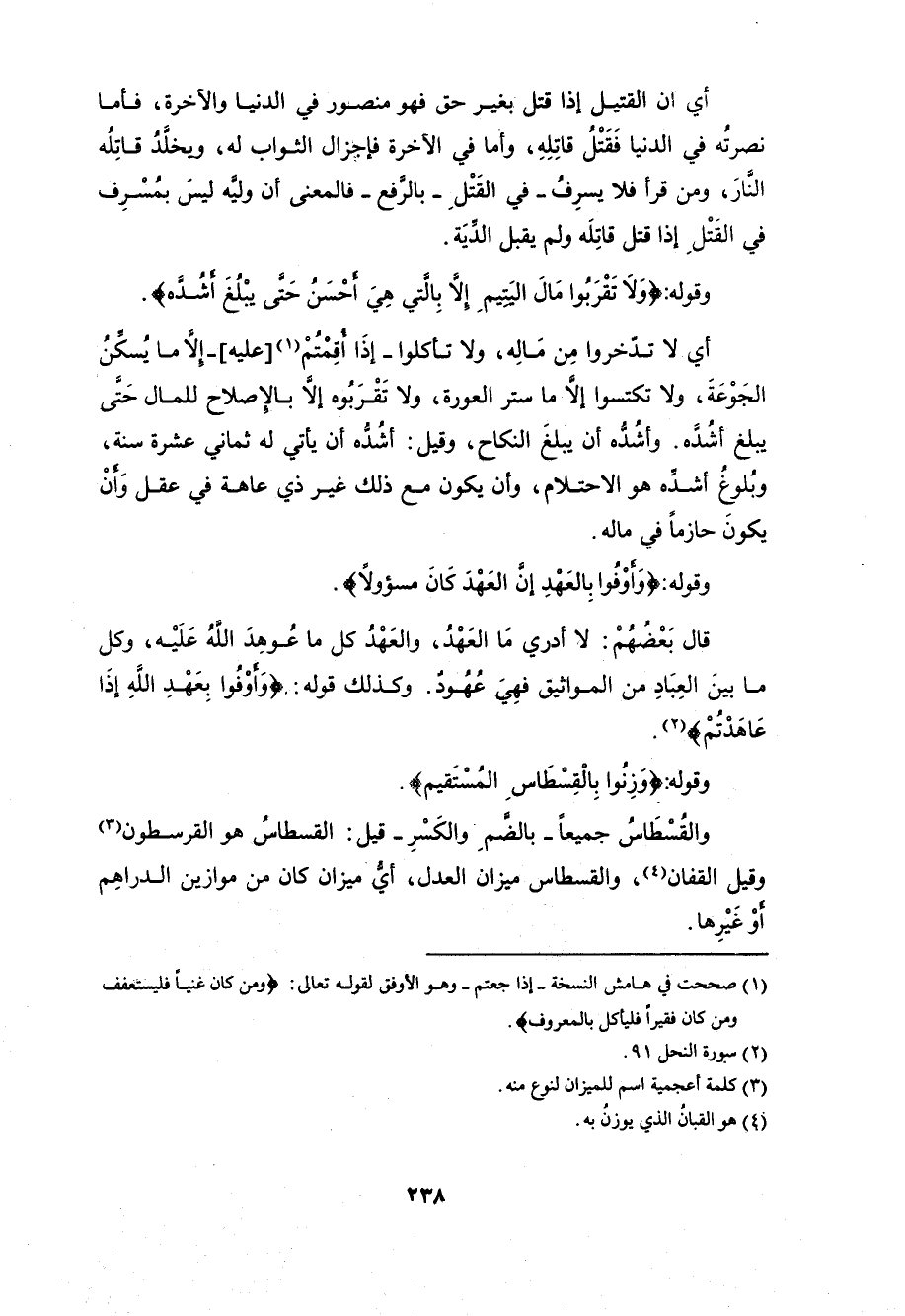 وقوله: (وَلَا تَقْرَبُوا مَالَ الْيَتِيمِ إِلَّا بِالَّتِي هِيَ أَحْسَنُ حَتَّى يَبْلُغَ أَشُدَّهُ وَأَوْفُوا بِالْعَهْدِ إِنَّ الْعَهْدَ كَانَ مَسْئُولًا (34)