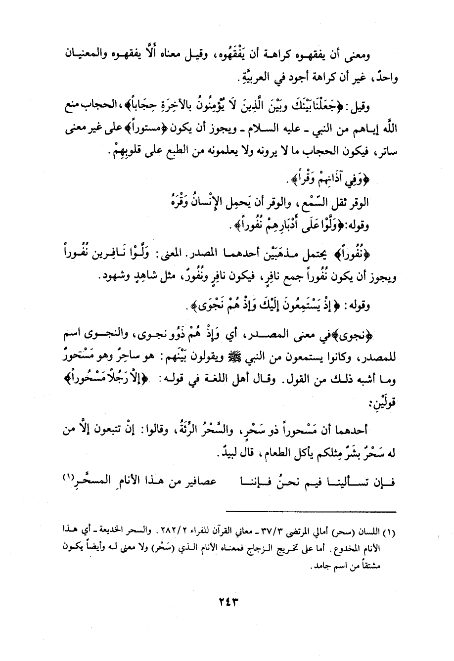 ومعنى (أَنْ يَفْقَهُوهُ) كراهة (أَنْ يَفْقَهُوهُ) وقيل معناه ألا يفقهوه والمعنيان