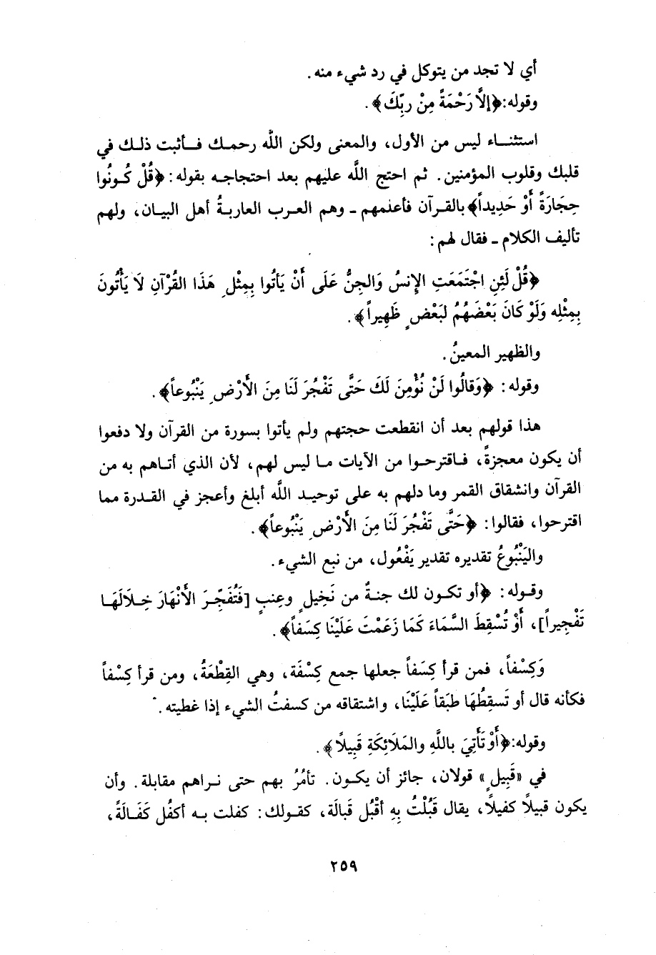 وقوله: (أَوْ تَكُونَ لَكَ جَنَّةٌ مِنْ نَخِيلٍ وَعِنَبٍ فَتُفَجِّرَ الْأَنْهَارَ خِلَالَهَا تَفْجِيرًا (91) أَوْ تُسْقِطَ السَّمَاءَ كَمَا زَعَمْتَ عَلَيْنَا كِسَفًا أَوْ تَأْتِيَ بِاللَّهِ وَالْمَلَائِكَةِ قَبِيلًا (92)
