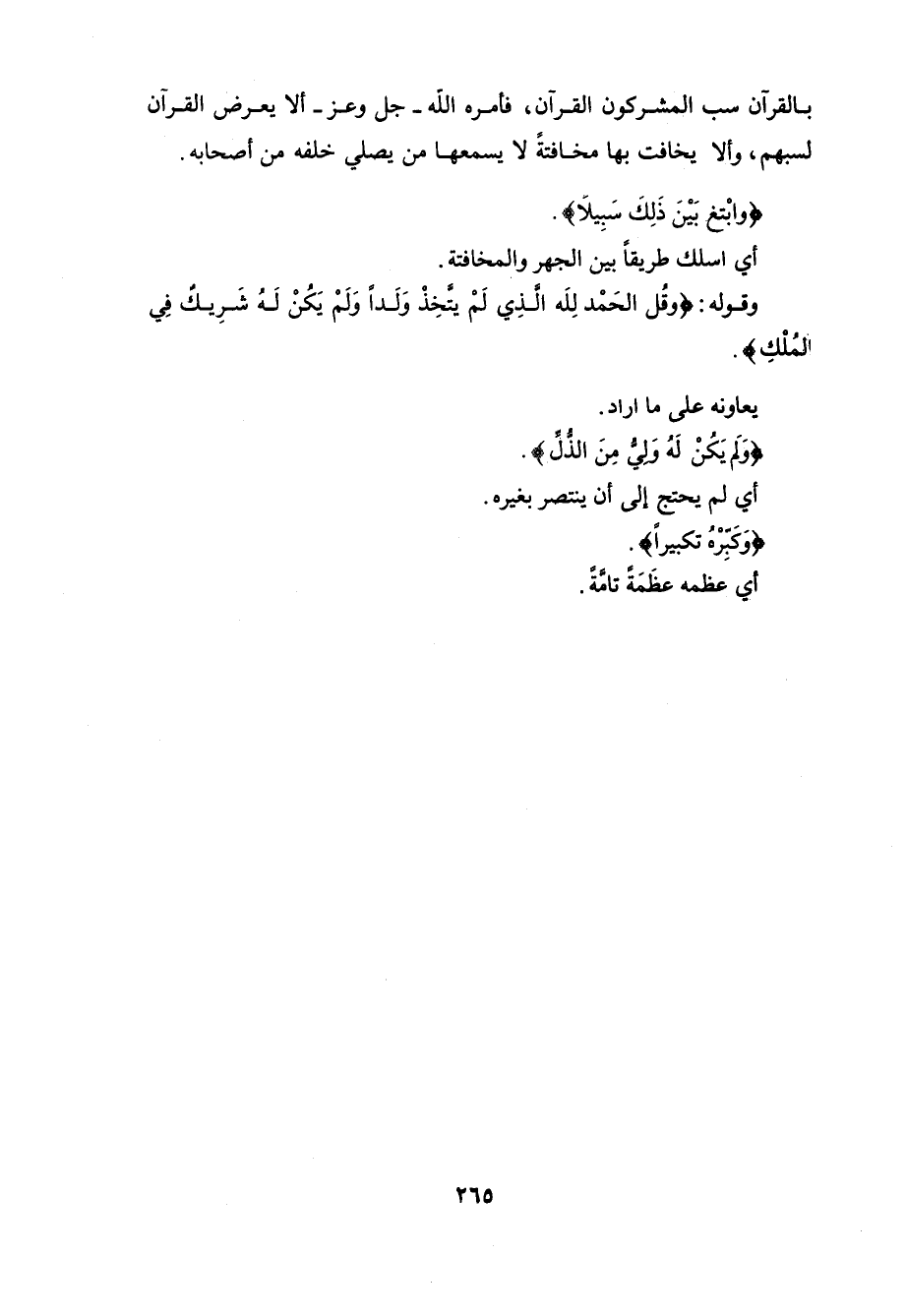 وقوله: (وَقُلِ الْحَمْدُ لِلَّهِ الَّذِي لَمْ يَتَّخِذْ وَلَدًا وَلَمْ يَكُنْ لَهُ شَرِيكٌ فِي الْمُلْكِ وَلَمْ يَكُنْ لَهُ وَلِيٌّ مِنَ الذُّلِّ وَكَبِّرْهُ تَكْبِيرًا (111)