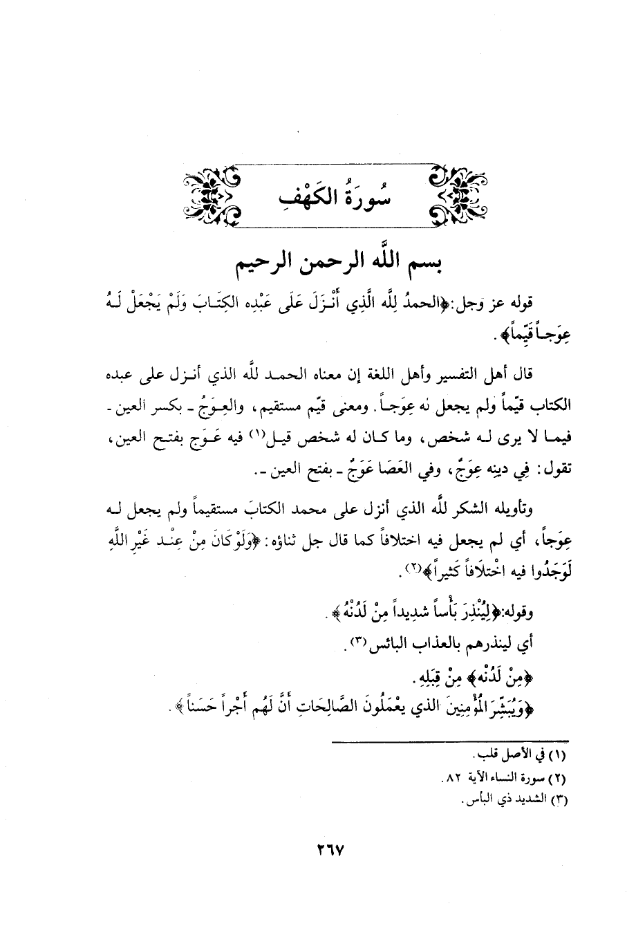 قوله عزَّ وجلَّ: (الْحَمْدُ لِلَّهِ الَّذِي أَنْزَلَ عَلَى عَبْدِهِ الْكِتَابَ وَلَمْ يَجْعَلْ لَهُ عِوَجًا (1)