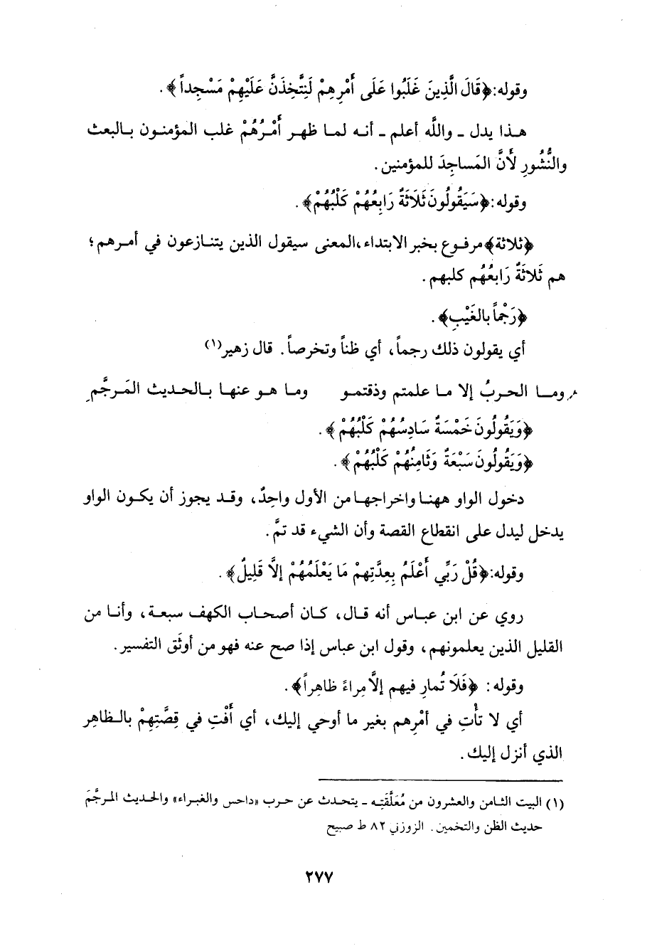 وقوله: (سَيَقُولُونَ ثَلَاثَةٌ رَابِعُهُمْ كَلْبُهُمْ وَيَقُولُونَ خَمْسَةٌ سَادِسُهُمْ كَلْبُهُمْ رَجْمًا بِالْغَيْبِ وَيَقُولُونَ سَبْعَةٌ وَثَامِنُهُمْ كَلْبُهُمْ قُلْ رَبِّي أَعْلَمُ بِعِدَّتِهِمْ مَا يَعْلَمُهُمْ إِلَّا قَلِيلٌ فَلَا تُمَارِ فِيهِمْ إِلَّا مِرَاءً ظَاهِرًا وَلَا تَسْتَفْتِ فِيهِمْ مِنْهُمْ أَحَدًا (22)