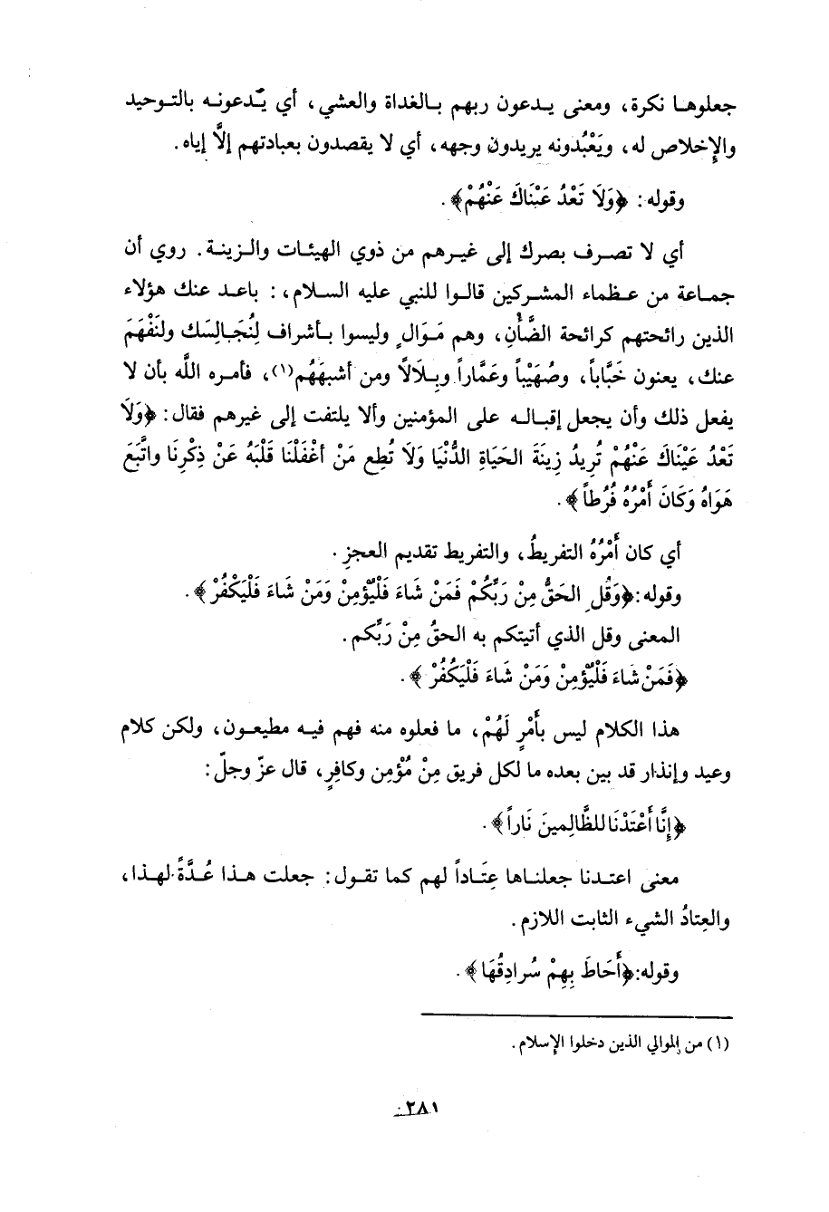 روي أن جماعة من عظماء المشركين قالوا للنبي عليه السلام،: باعد عنك هؤلاء الذين رائحتهم كرائحة الضَّأنِ، وهم مَوَال وليسوا بأشراف لِنُجالِسَك ولنَفْهَمَ عنك، يعنون خَبَّاباً، وصُهَيْباً وعَمَّاراً - وبِلَالًا ومن أشبهَهُم، فأمره اللَّه بأن لا يفعل ذلك وأن يجعل إقباله على المؤمنين وألا يلتفت إلى غيرهم فقال: (وَلَا تَعْدُ عَيْنَاكَ عَنْهُمْ تُرِيدُ زِينَةَ الْحَيَاةِ الدُّنْيَا وَلَا تُطِعْ مَنْ أَغْفَلْنَا قَلْبَهُ عَنْ ذِكْرِنَا وَاتَّبَعَ هَوَاهُ وَكَانَ أَمْرُهُ فُرُطًا).