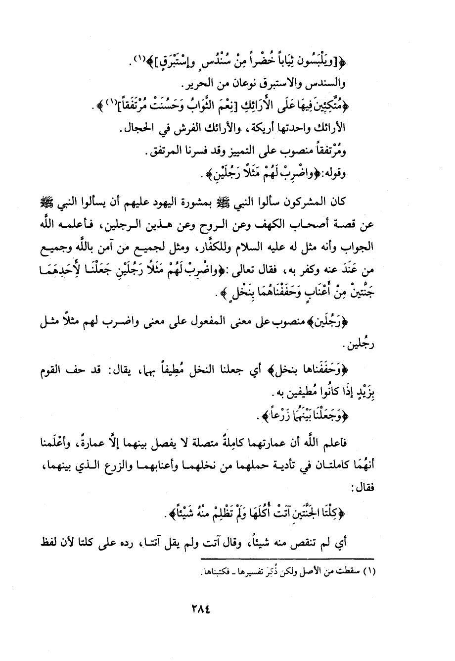وقوله: (وَاضْرِبْ لَهُمْ مَثَلًا رَجُلَيْنِ جَعَلْنَا لِأَحَدِهِمَا جَنَّتَيْنِ مِنْ أَعْنَابٍ وَحَفَفْنَاهُمَا بِنَخْلٍ وَجَعَلْنَا بَيْنَهُمَا زَرْعًا (32)