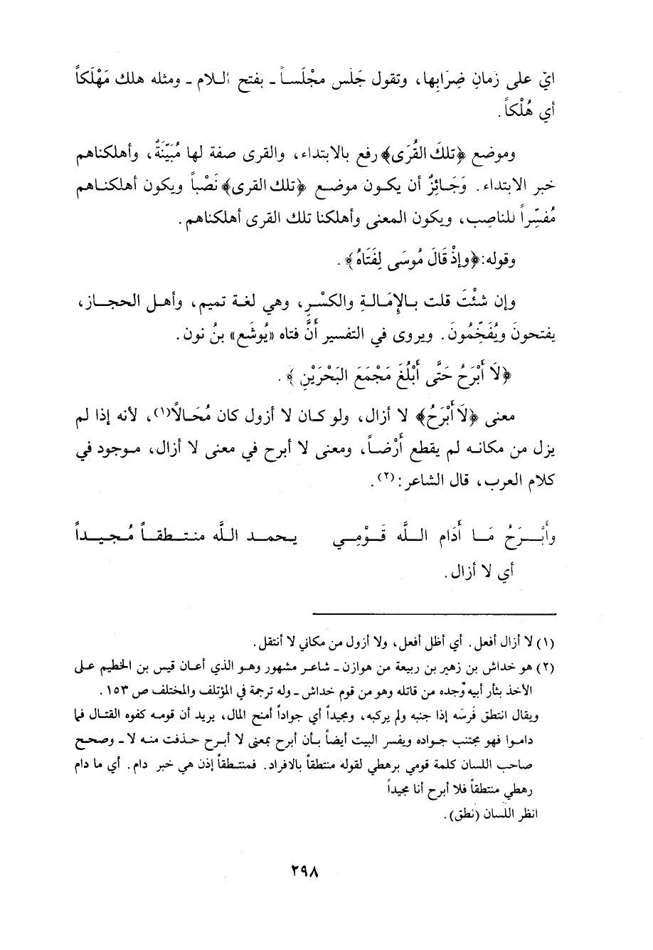 يزل من مكانه لم يقطع أَرْضاً، ومعنى لا أبرح في معنى لا أزال - موجود في