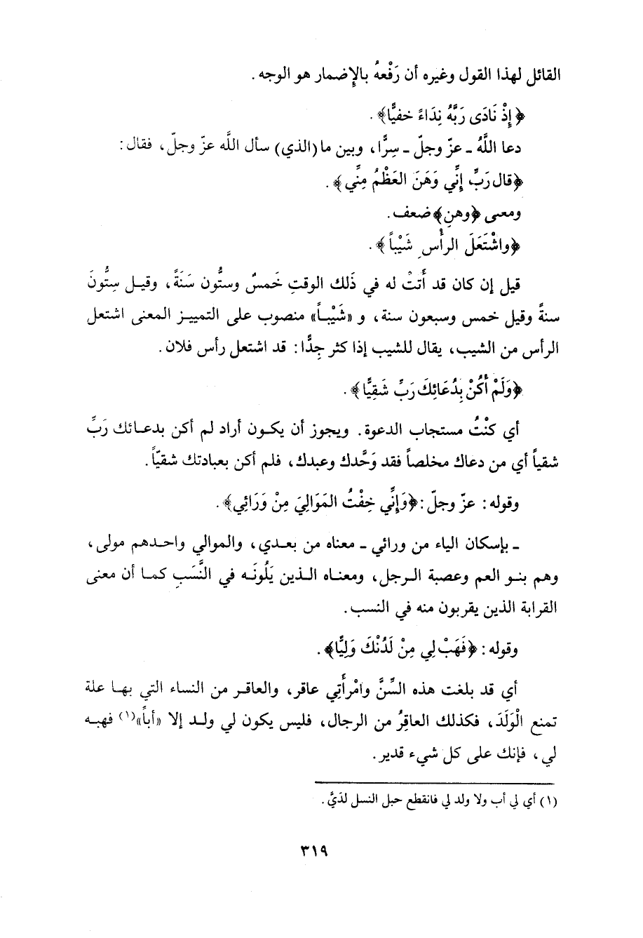 وقوله: عزَّ وجلَّ: (وَإِنِّي خِفْتُ الْمَوَالِيَ مِنْ وَرَائِي وَكَانَتِ امْرَأَتِي عَاقِرًا فَهَبْ لِي مِنْ لَدُنْكَ وَلِيًّا (5)