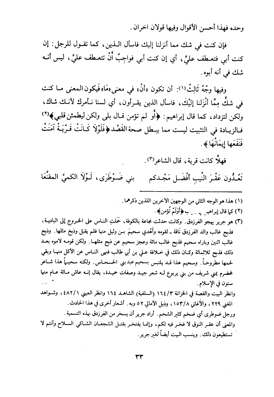 ولا بأن الجزاء وقع أو لم يقع، بل ليس فيها إلا بيان أن ماهية ذلك الشرط مستلزمة لماهية ذلك الجزاء فقط، والدليل عليه أنك إذا قلت إن كانت الخمسة زوجاً كانت منقسمة بمتساويين، فهو كلام حق، لأن معناه أن كون الخمسة زوجاً يستلزم كونها منقسمة بمتساويين، ثم لا يدل هذا الكلام على أن الخمسة زوج ولا على أنها منقسمة بمتساويين فكذا ههنا هذه الآية، تدل على أنه لو حصل هذا الشك لكان الواجب فيه هو فعل كذا وكذا، فأما إن هذا الشك وقع أو لم يقع، فليس في الآية دلالة عليه، والفائدة في إنزال هذه الآية على الرسول أن تكثير الدلائل وتقويتها مما يزيد في قوة اليقين وطمأنينة النفس وسكون الصدر، ولهذا السبب أكثر الله في كتابه من تقرير دلائل التوحيد والنبوة.