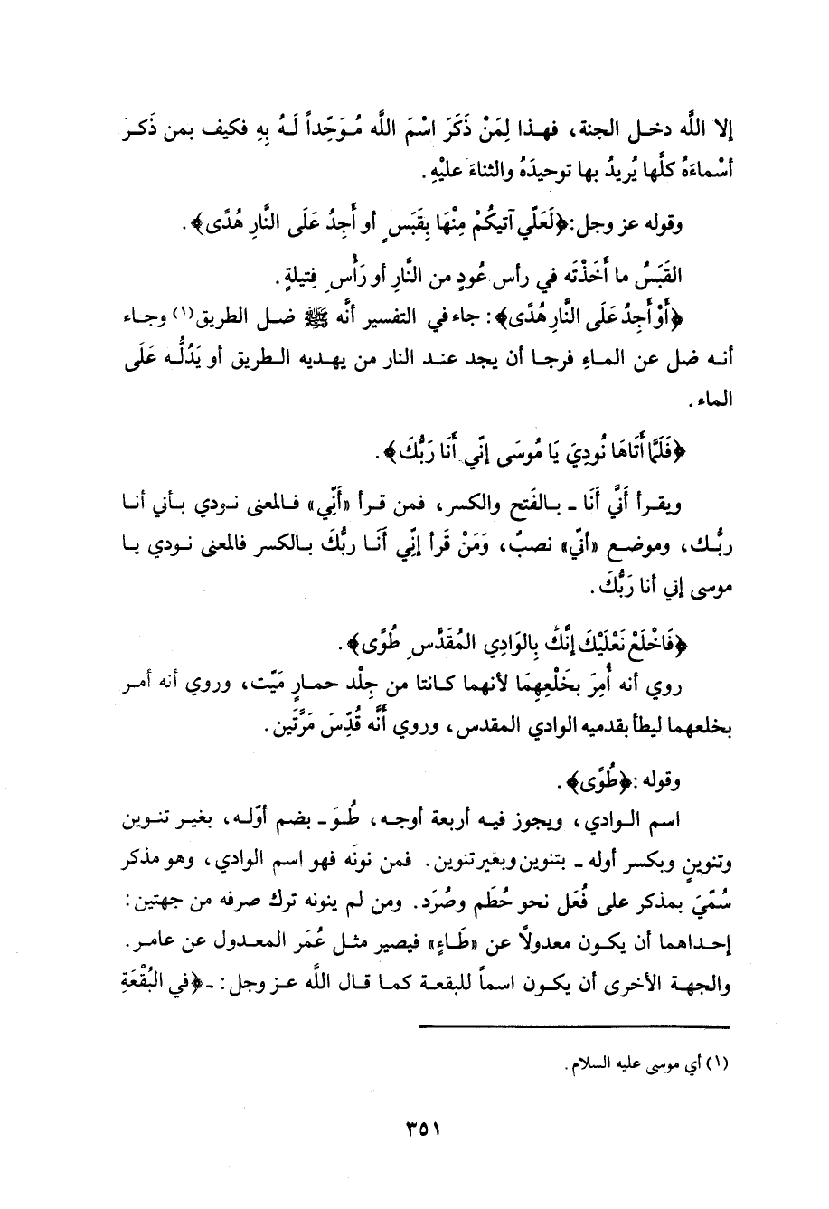 طُوَى - بضم أوله، بغير تنوين وتنوينٍ وبكسر أوله - بتنوين وبغير تنوين. فمن نوَّنَه فهو اسم الوادي، وهو مذكر سُمِّيَ بمذكرعلى فُعَل نحو حُطَم وصُرَد. ومن لم ينونه ترك صرفه من جهتين: