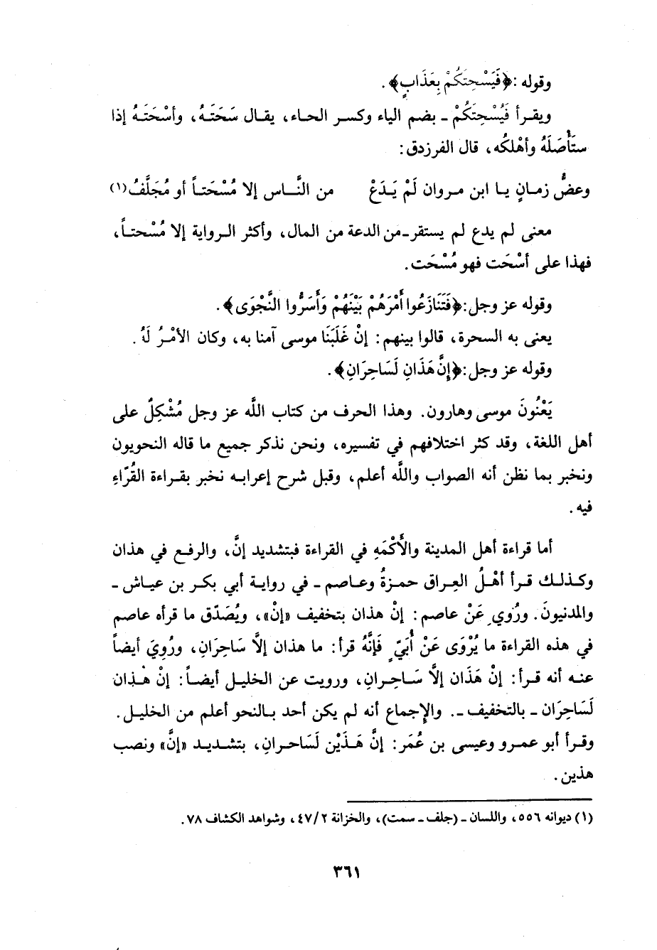 فأَمَّا القراءةُ الأولى وهي قراءةُ ابنِ كثير وحفص فأوضحُ القراءاتِ معنىً ولفظاً وخَطَّاً؛ وذلك أنهما جعلا «إنْ» المخففةَ من الثقيلة فَأُهْمِلَتْ، ولَمَّا أُهْمِلَتْ كما هو الأفصحُ مِنْ وجهيها خِيْفَ التباسُها بالنافية فجيء باللامِ فارقةً في الخبر. ف «هذان» مبتدأٌ، و «لَساحران» خبرُه، ووافَقَتْ خَطَّ المصحفِ؛ فإن الرسم «هذن» بدونِ ألفٍ ولا ياءٍ وسيأتي بيانُ ذلك.