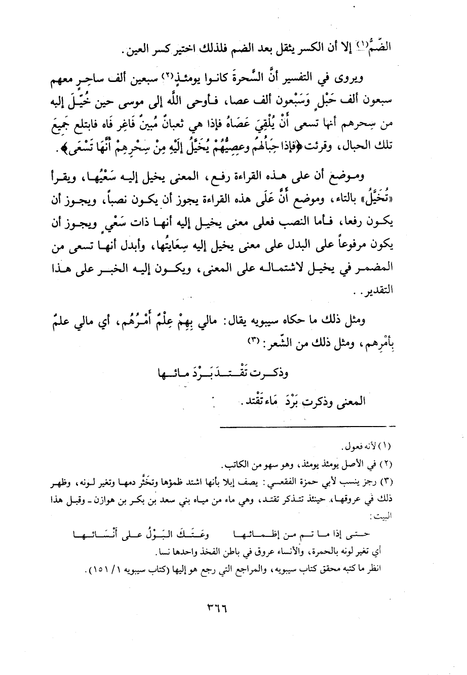 قوله: {يُخَيَّلُ إِلَيْهِ} قرأ العامَّة «يُخَيَّل» بضمِّ الياء الأولى وفتحِ الثانية مبنياً للمفعول. و «أنَّها تَسْعى» مرفوعٌ بالفعلِ قبلَه لقيامِه مقامَ الفاعلِ تقديرُه: يُخَيَّل إليه سَعْيُها. وجوَّز أبو البقاء فيه وجهين آخرين: أحدهما: أَنْ يكونَ القائمُ مَقامَ الفاعلِ ضميرَ الحبالِ والعِصِيِّ، وإنما ذُكِّرَ ولم يَقُلْ ِ «تُخَيَّل» بالتاء مِنْ فوقُ؛ لأنَّ تأنيثَ الحبالِ غيرُ حقيقي. الثاني: أنَّ القائمَ مقامَ الفاعلِ ضميرٌ يعودُ على المُلْقى، ولذلك ذُكِّرَ. وعلى الوجهين ففي قولِه «أنها تسعى» وجهان، أحدُهما: أنَّه بدلُ اشتمالٍ من ذلك الضمير المستترِ في «يُخَيَّل». والثاني: أنه مصدرٌ في موضع نصبٍ على الحالِ من الضميرِ المستتر أيضاً. والمعنى: يُخَيَّل إليه هي أنها ذاتُ سَعْيٍ. ولا حاجةَ إلى هذا، وأيضاً فقد نَصُّوا على أنَّ المصدرَ المؤول لا يقع موقعَ الحالِ. لو قلت: «جاء زيدٌ أَنْ يركضَ» تريد ركضاً، بمعنى ذا ركض، لم يَجُزْ.