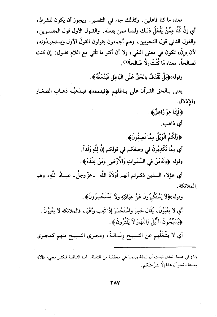 وقوله: (بَلْ نَقْذِفُ بِالْحَقِّ عَلَى الْبَاطِلِ فَيَدْمَغُهُ فَإِذَا هُوَ زَاهِقٌ وَلَكُمُ الْوَيْلُ مِمَّا تَصِفُونَ (18)