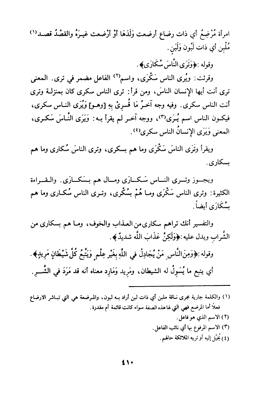 وإثباتُ السُّكْرِ وعَدَمُه بمعنى الحقيقة والمجاز أي: وترى الناس سكرى على التشبيه، وما هم بسَكْرى على التحقيق. قال الزمخشري: «فإنْ قلتَ: لِمَ قيل أولاً: تَرَوْن، ثم قيل:» ترى «على الإِفراد؟ قلت: لأنَّ الرؤيةَ أولاً عُلِّقَتْ بالزلزلة، فَجُعِل الناسُ جميعاً رائِيْنَ لها، وهي معلَّقَةٌ أخيراً بكونِ الناسِ على حالِ السُّكر، فلا بُدَّ أن يُجْعَلَ كلُّ واحدٍ منهم رائياً لسائرِهم». اهـ (الدُّرُّ المصُون).