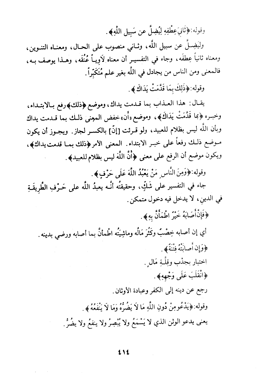 وقوله: (ثَانِيَ عِطْفِهِ لِيُضِلَّ عَنْ سَبِيلِ اللَّهِ لَهُ فِي الدُّنْيَا خِزْيٌ وَنُذِيقُهُ يَوْمَ الْقِيَامَةِ عَذَابَ الْحَرِيقِ (9)