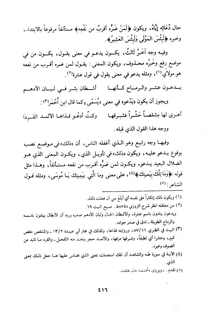 والجملة في محلِّ نصبٍ، كما تكون كذلك بعد أفعالِ القلوب. الثالث: أَنْ يُضَمَّن يَدْعُو معنى يزعم، فيُعَلَّق كما يُعَلَّقُ، والكلامُ فيه كالكلامِ في الوجهِ الذي قبله. الرابع: أن الأفعالَ كلَّها يجوزُ أَنْ تُعَلَّق قلبيةً كانت أو غيرَها فاللامُ معلِّقَةٌ ل «يَدْعوا»، وهو مذهبُ يونسَ. فالجملةُ بعده الكلامُ فيها كما تقدَّم.