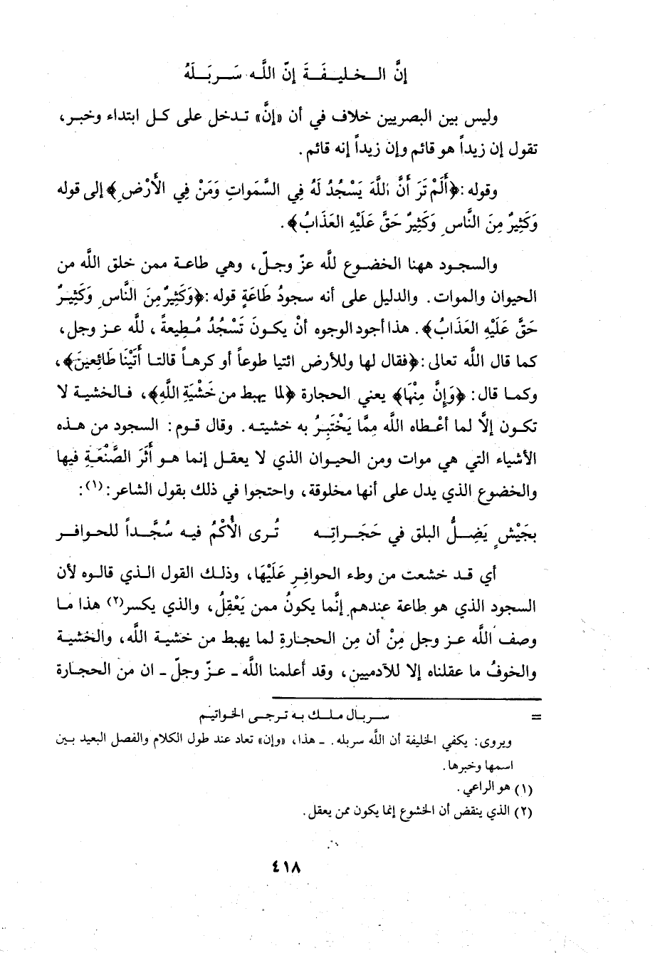 وقال قوم: السجود من هذه الأشياء التي هي موات ومن الحيوان الذي لا يعقل إنما هو أثَرَ الصنعَةِ فيها والخضوع الذي يدل على أنها مخلوقة، واحتجوا في ذلك بقول الشاعر::