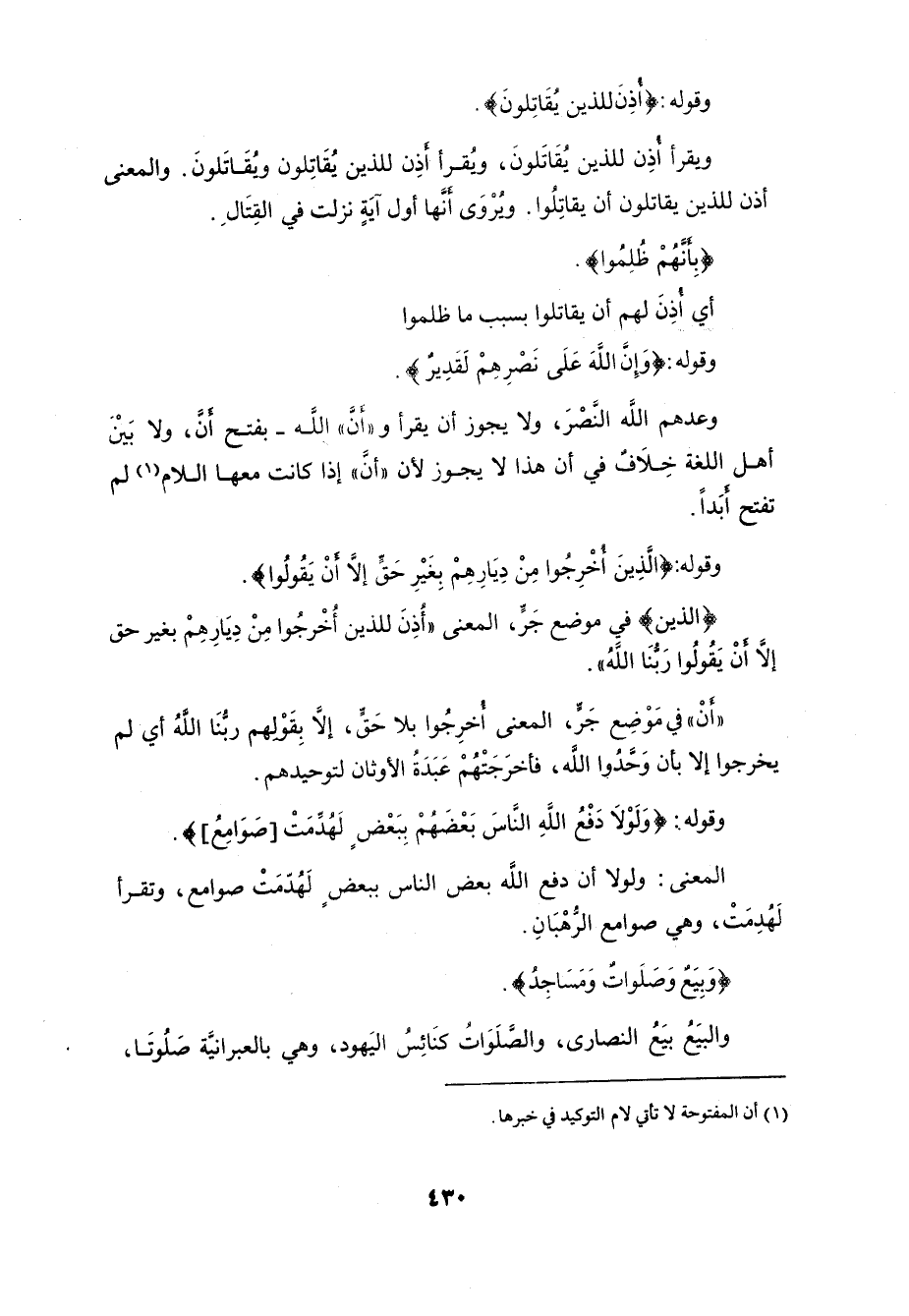 وقوله: (الَّذِينَ أُخْرِجُوا مِنْ دِيَارِهِمْ بِغَيْرِ حَقٍّ إِلَّا أَنْ يَقُولُوا رَبُّنَا اللَّهُ وَلَوْلَا دَفْعُ اللَّهِ النَّاسَ بَعْضَهُمْ بِبَعْضٍ لَهُدِّمَتْ صَوَامِعُ وَبِيَعٌ وَصَلَوَاتٌ وَمَسَاجِدُ يُذْكَرُ فِيهَا اسْمُ اللَّهِ كَثِيرًا وَلَيَنْصُرَنَّ اللَّهُ مَنْ يَنْصُرُهُ إِنَّ اللَّهَ لَقَوِيٌّ عَزِيزٌ (40)
