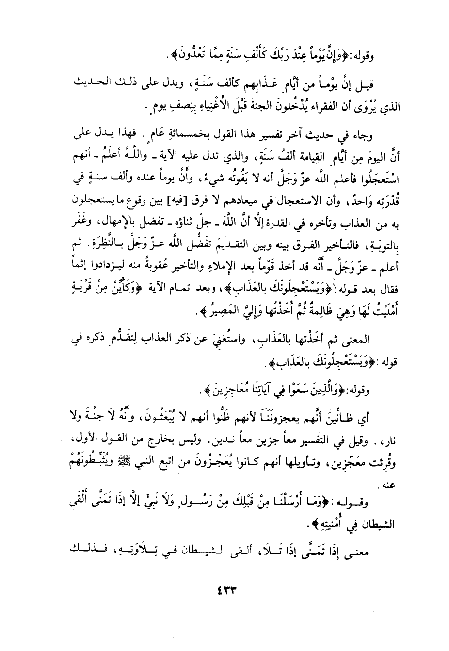 فهذا يدل على أنَّ اليومَ مِن أيامِ القِيامة ألف سَنَةٍ، والذي تدل عليه الآية - واللَّهُ أعلَم - أنهم اسْتَعجَلوا فأعلمَ اللَّهُ عز وَجَلَّ أنه لا يَفُوته شيء وأن يوماً عنده وألف سنةٍ في قُدْرَتِه وَاحدٌ، وأن الاستعجال في ميعادهم لا فرق فيه بين وقوع ما يستعجلون به من العذاب وتأخره في القدرة إلَّا أنَّ اللَّهَ - جل ثناؤه - تفضل بالإِمهال، وغَفَر بِالتوبَةِ، فالتأخير الفرق بينه وبين التقديم تفَضل الله عزَّ وَجَل بالنَظِرَةِ.