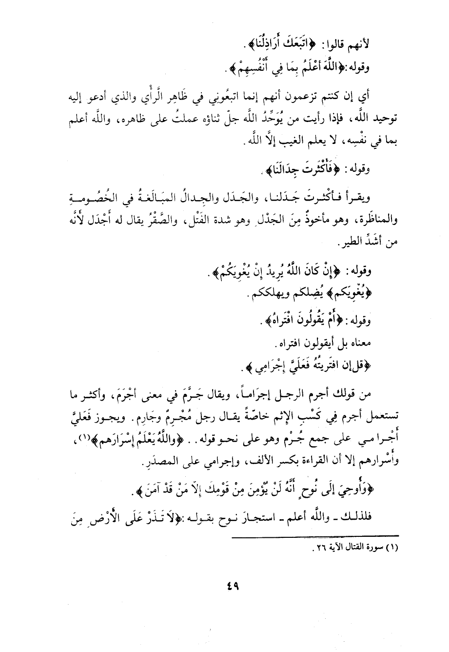 وقوله: (قَالُوا يَا نُوحُ قَدْ جَادَلْتَنَا فَأَكْثَرْتَ جِدَالَنَا فَأْتِنَا بِمَا تَعِدُنَا إِنْ كُنْتَ مِنَ الصَّادِقِينَ (32)