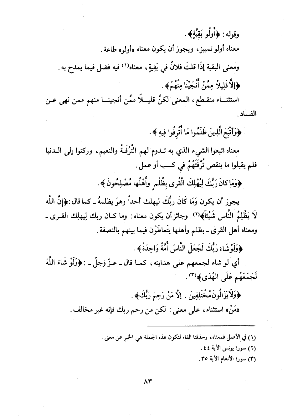 وقوله: (فَلَوْلَا كَانَ مِنَ الْقُرُونِ مِنْ قَبْلِكُمْ أُولُو بَقِيَّةٍ يَنْهَوْنَ عَنِ الْفَسَادِ فِي الْأَرْضِ إِلَّا قَلِيلًا مِمَّنْ أَنْجَيْنَا مِنْهُمْ وَاتَّبَعَ الَّذِينَ ظَلَمُوا مَا أُتْرِفُوا فِيهِ وَكَانُوا مُجْرِمِينَ (116)