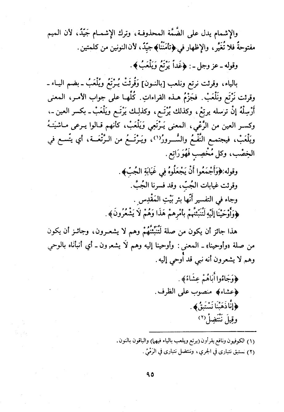 فَمَنْ قرأ بالنون أسند الفعلَ إلى إخوة يوسف، ومَنْ قرأ بالياء أسند الفعل إليه دونهم، ومَنْ كسَر العين اعتقد أنه جزم بحذف حرفِ العلة، وجعله مأخوذاً [مِنْ] يَفْتَعِل من الرَّعْي كيرتمي مِن الرمي. ومَنْ سَكَّن العينَ اعتقد أنه جَزَمَهَ بحذف الحركة وجعله مأخوذاً مِنْ رتعَ يَرْتَعُ إذا اتِّسع في الخِصْب قال: