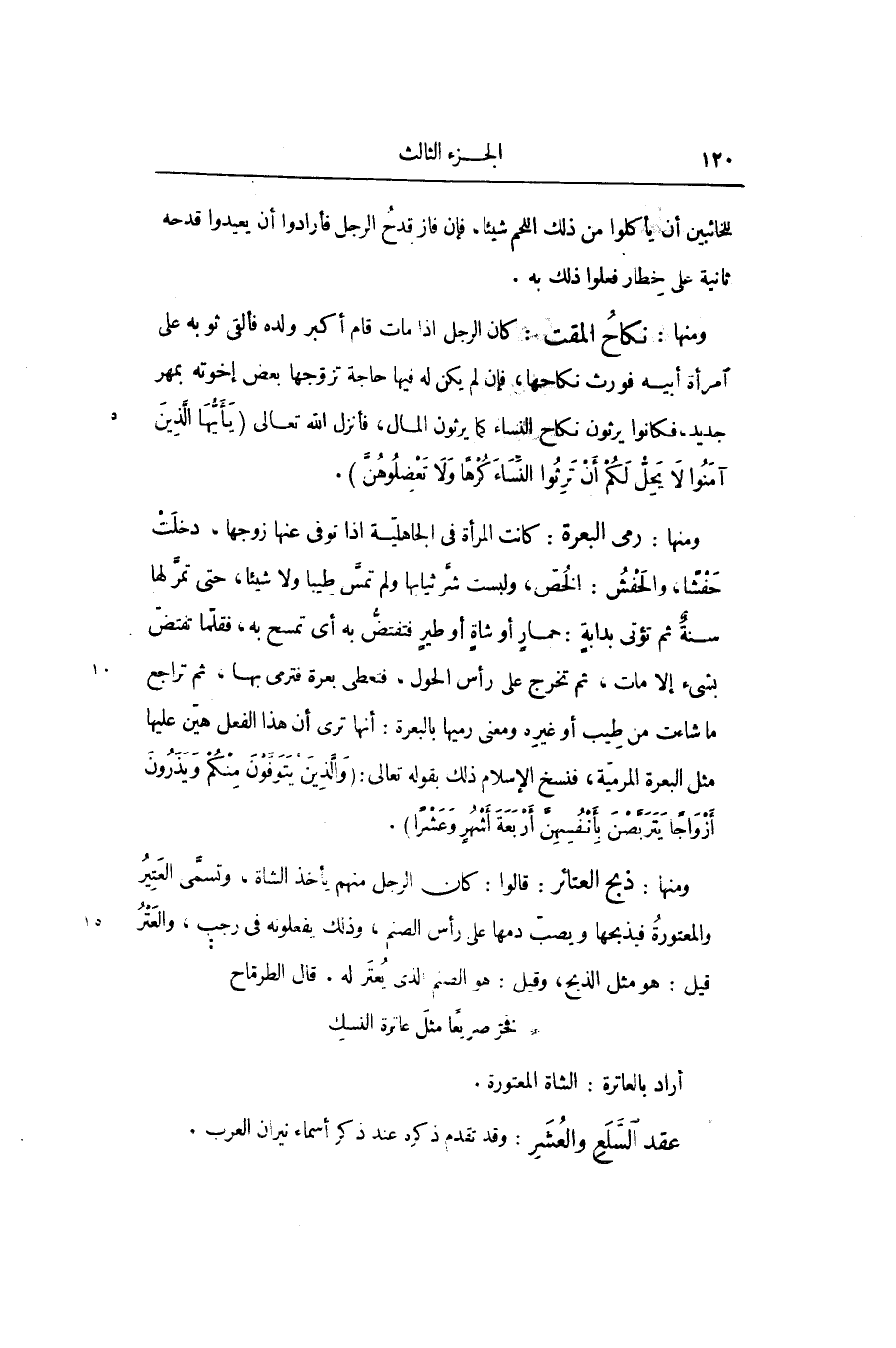 كانت المرأة في الجاهليّة اذا توفى عنها زوجها، دخلت حفشا، والحفش: الخصّ، ولبست شرّ ثيابها ولم تمسّ طيبا ولا شيئا، حتى تمرّ لها سنة ثم تؤتى بدابة: حمار أو شاة أو طير فتفتضّ به أى تمسح به، فقلّما تفتضّ بشىء إلا مات، ثم تخرج على رأس الحول، فتعطى بعرة فترمى بها، ثم تراجع ما شاءت من طيب أو غيره ومعنى رميها بالبعرة: أنها ترى أن هذا الفعل هيّن عليها مثل البعرة المرميّة، فنسخ الإسلام ذلك بقوله تعالى: (وَالَّذِينَ يُتَوَفَّوْنَ مِنْكُمْ وَيَذَرُونَ أَزْواجاً يَتَرَبَّصْنَ بِأَنْفُسِهِنَّ أَرْبَعَةَ أَشْهُرٍ وَعَشْراً) .