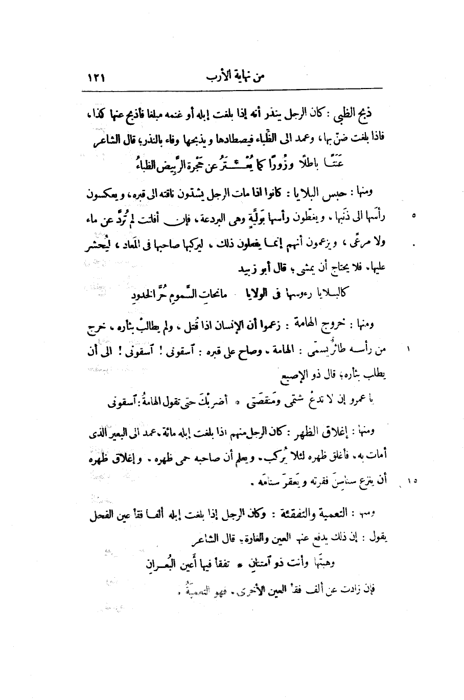 كانوا اذا مات الرجل يشدّون ناقته الى قبره، ويعكسون رأسها الى ذنبها، ويغطّون رأسها بولّية وهى البردعة، فإن أفلتت لم تردّ عن ماء ولا مرعى، ويزعمون أنهم إنما يفعلون ذلك، ليركبها صاحبها في المعاد، ليحشر عليها، فلا يحتاج أن يمشى؛ قال أبو زبيد