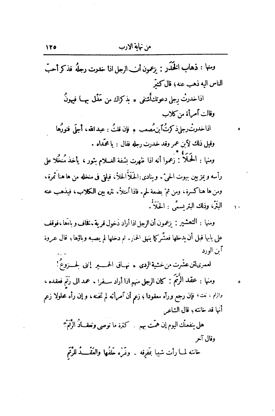زعموا أنه اذا ظهرت بشفة الغلام بثور، يأخذ منخلا على رأسه ويمرّبين بيوت الحىّ، وينادى: الحلأ الحلأ، فيلقى في منخله من هاهنا ثمرة، ومن هاهنا كسرة، ومن ثمّ بضعة لحم، فاذا امتلأ، نثره بين الكلاب، فيذهب عنه البثر، وذلك البثر يسمّى: الحلأ.