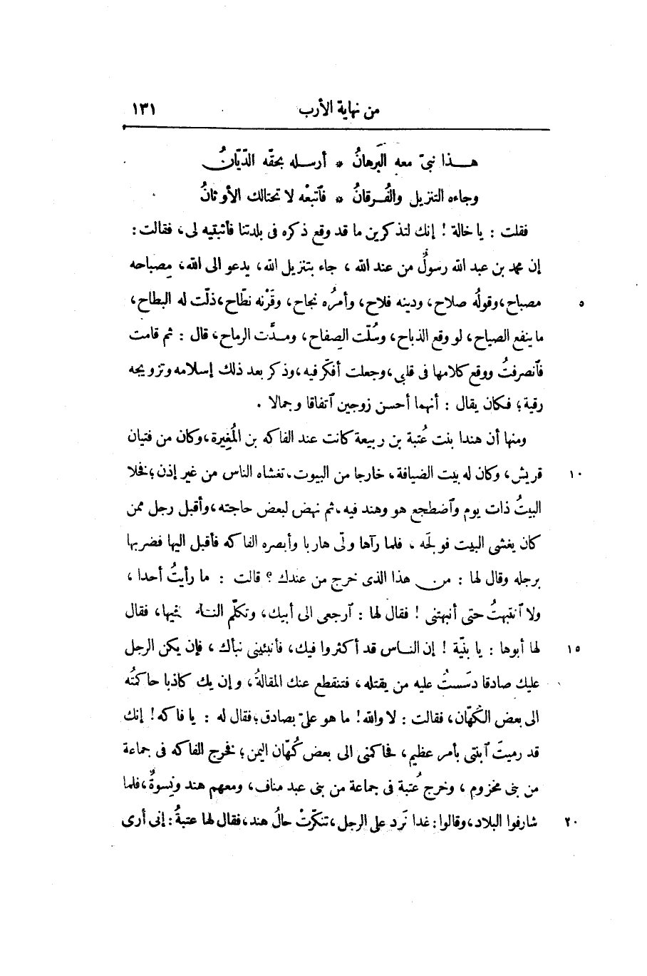 إن محمد بن عبد الله رسول من عند الله، جاء بتنزيل الله، يدعو الى الله، مصباحه مصباح، وقوله صلاح، ودينه فلاح، وأمره نجاح، وقرنه نطّاح، ذلّت له البطاح، ما ينفع الصياح، لو وقع الذباح، وسلّت الصفاح، ومدّت الرماح، قال: ثم قامت فانصرفت ووقع كلامها في قلبى، وجعلت أفكر فيه، وذكر بعد ذلك إسلامه وتزويجه رقية؛ فكان يقال: أنهما أحسن زوجين اتفاقا وجمالا.