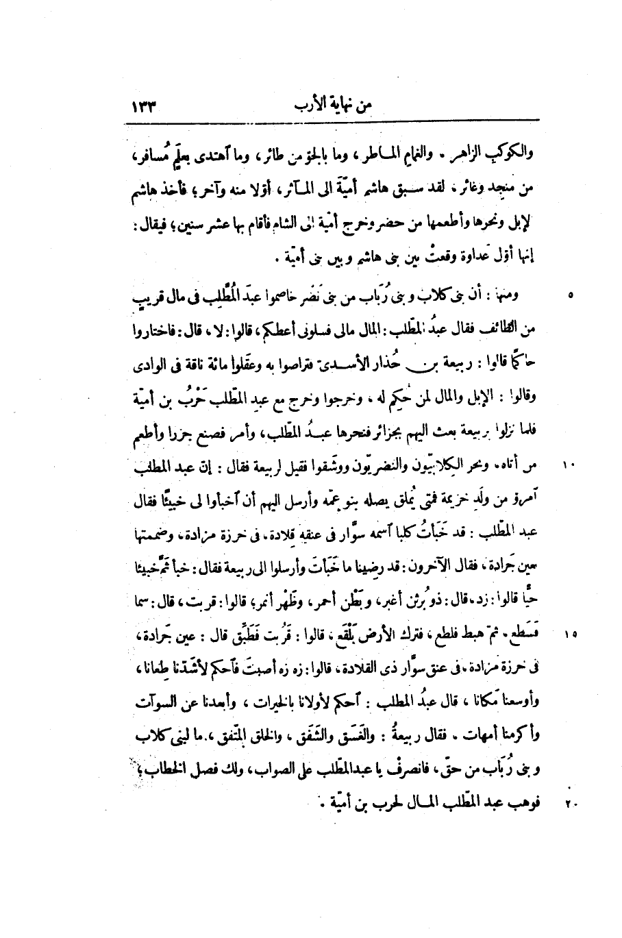 والكوكب الزاهر، والغمام الماطر، وما بالجوّ من طائر، وما اهتدى بعلم مسافر، من منجد وغائر، لقد سبق هاشم أميّة الى المآثر، أوّلا منه وآخر؛ فأخذ هاشم لإبل ونحرها وأطعمها من حضر وخرج أميّة الى الشام فأقام بها عشر سنين؛ فيقال: